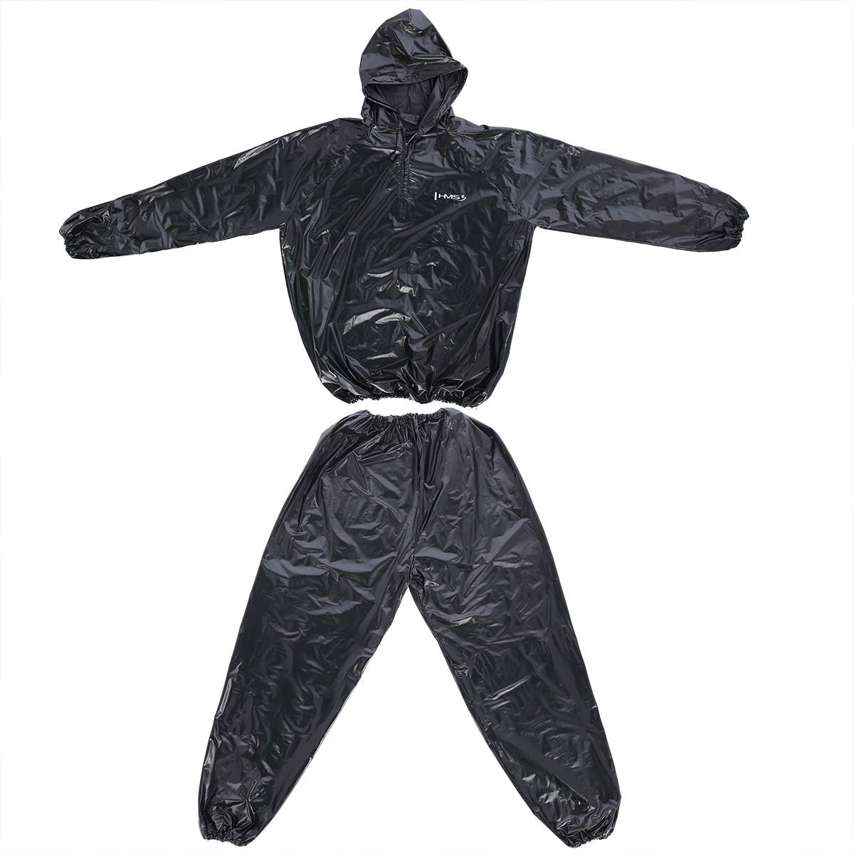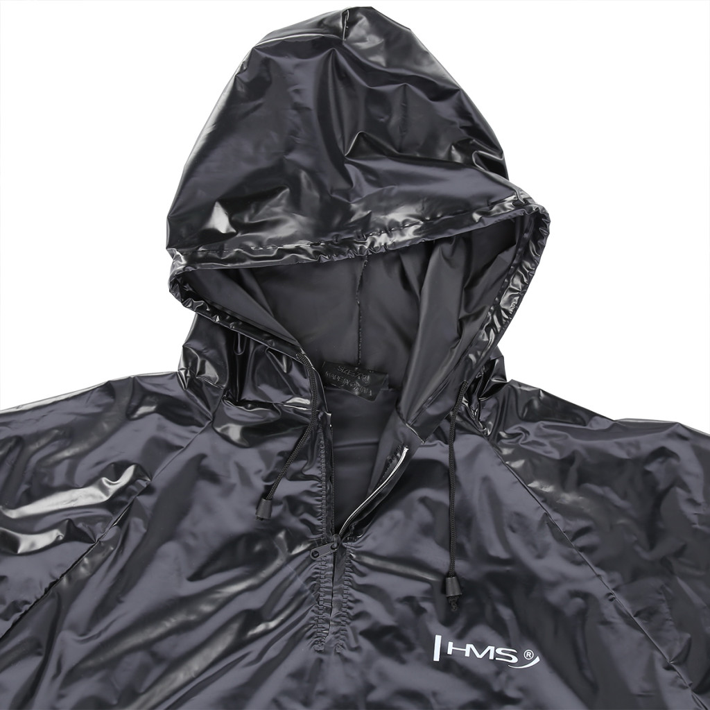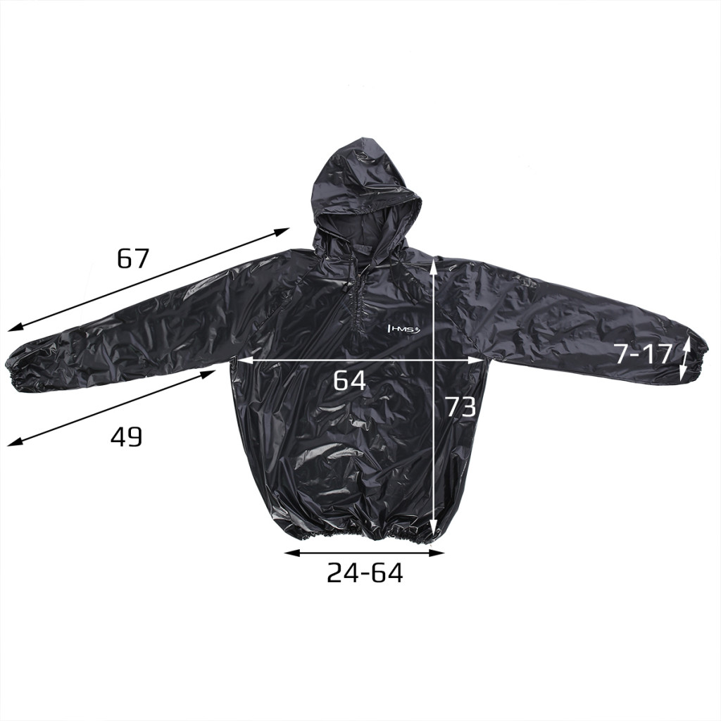 Sauna oblek HMS DSS12 je nepriepustný komplet nohavíc a trička s dlhým rukávom a kapucňou. Sauna dress je ideálnym nástrojom pre športovcov, ktorí potrebujú rýchlo znížiť telesnú hmotnosť o 2 - 3 kilogramy. Tréning v obleku spôsobuje, že rýchlo stúpa povrchová teplota tela, spaľujeme väčšie množstvo energie, viac sa potíme a z organizmu odvádzame väčšie množstvo vody, než v klasickom oblečení.