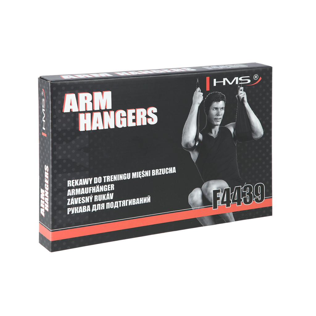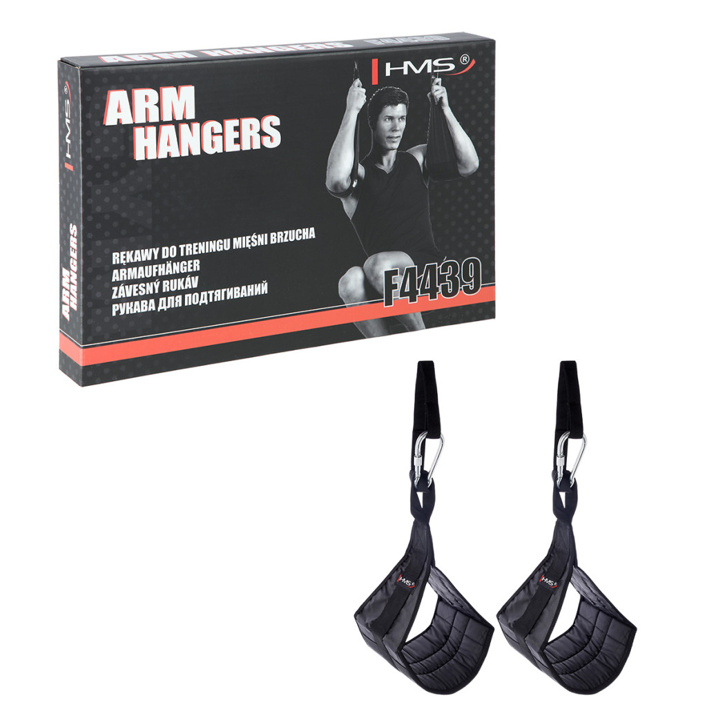 Arm Hanger HMS F4439 sú závesné rukávy, ktoré uľahčujú tréning brušných svalov. Dodané dva rukávy pomocou karabíny zavesíte na ľubovoľnú tyč, potom len prevlečiete paže rukávmi a začnete tréning. Použité, kvalitné materiály sú zárukou dlhej životnosti. Nosnosť 2 rukávov je až 100 kilogramov.