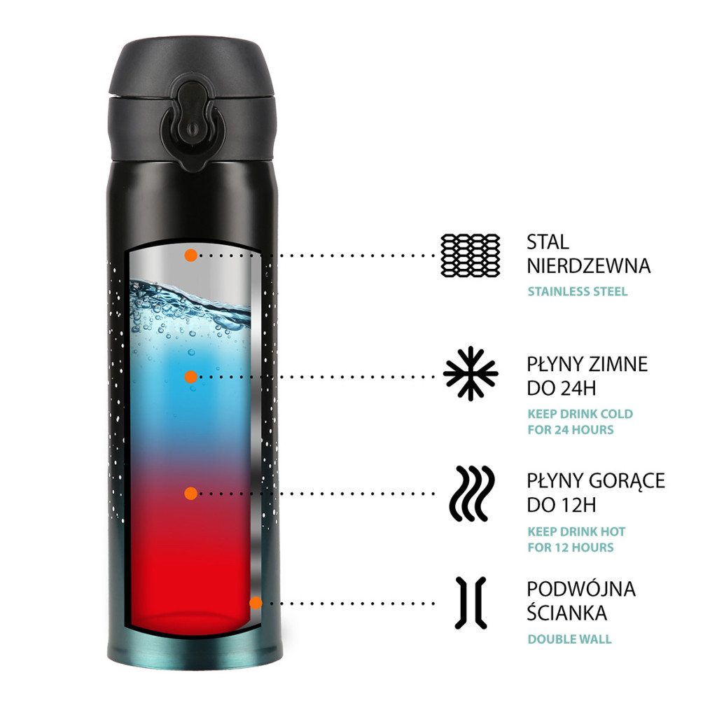 Termoska je vyrobená z nerezovej ocele s dvojitou stenou, ktorá zaručuje uchovanie teplých nápojov po dobu 12 hodín a studených po dobu 24 hodín, nezáleží teda, či si do termosky pripravíte rannú kávu, ktorú vypijete v kancelárii alebo či si do nej zalejete obľúbenú limonádu a vezmete si ju so sebou na niekoľkohodinovú prechádzku do prírody, termoska udrží Váš nápoj v správnej teplote.