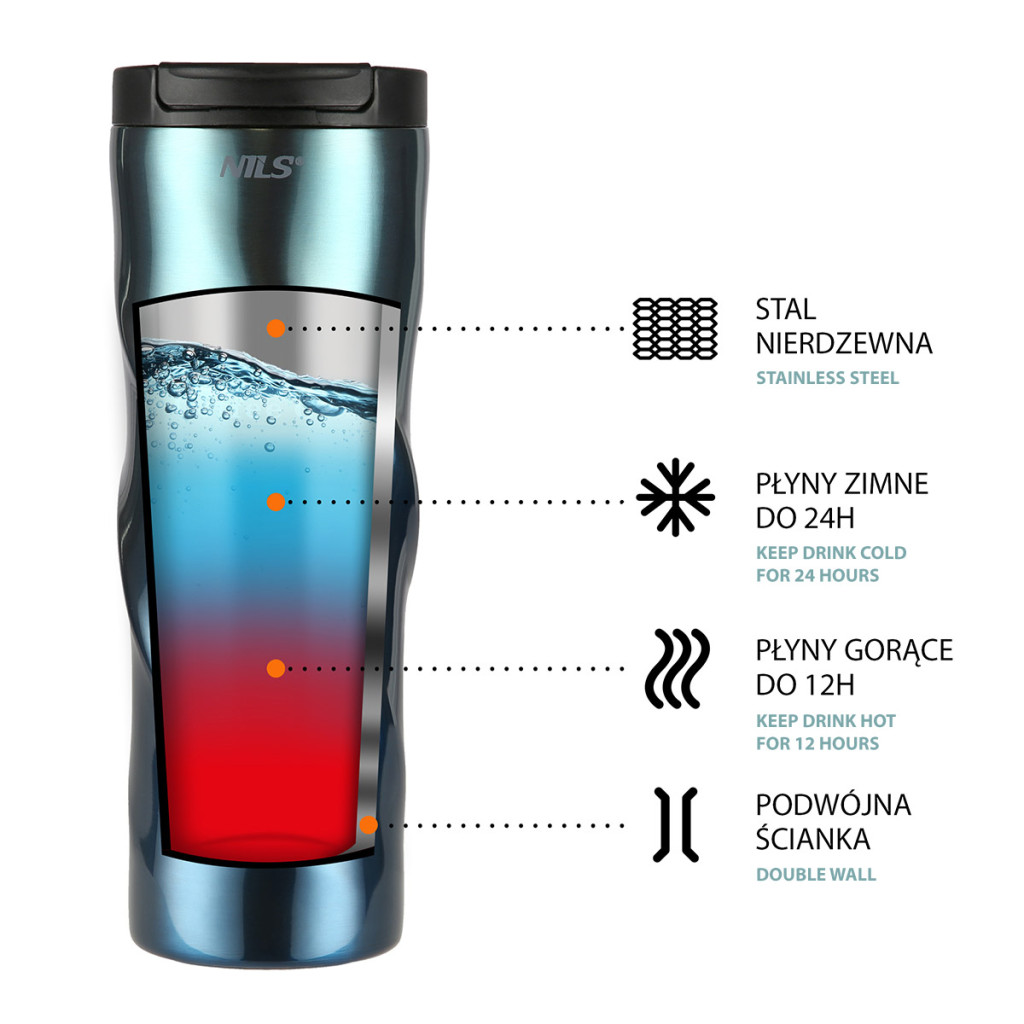 Termohrnček je vyrobený z nerezovej ocele s dvojitou stenou, ktorá zaručuje uchovanie teplých nápojov po dobu 12 hodín a studených po dobu 24 hodín, nezáleží teda, či si do hrnčeka pripravíte rannú kávu, ktorú vypijete cestou do práce alebo či si do neho zalejete obľúbenú limonádu a vezmete si ho so sebou na niekoľkohodinovú prechádzku do prírody, termohrnček udrží Váš nápoj v správnej teplote.