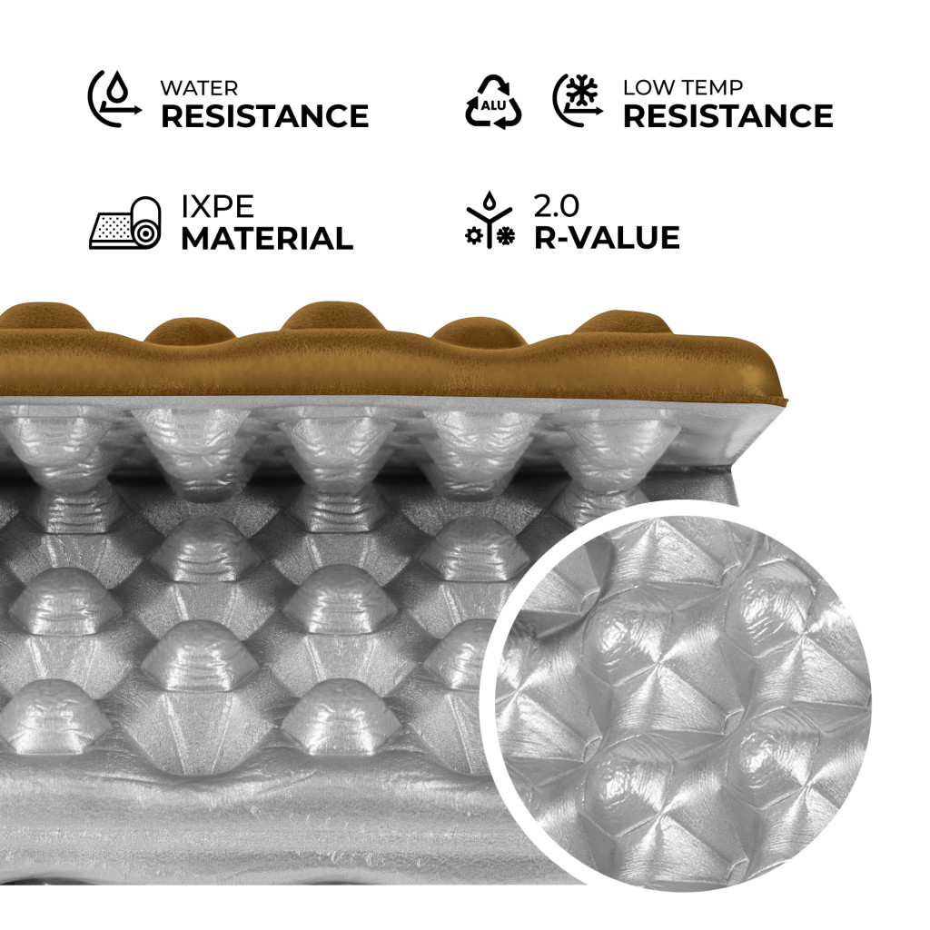 Podložka je vyrobená z vysoko kvalitnej peny IXPE – materiálu, ktorý sa vyznačuje zvýšenou pružnosťou a odolnosťou, a zároveň zostáva ľahký, odolný a nevsakuje vodu. IXPE si zachováva svoj tvar aj pri intenzívnom používaní, čo zaručuje dlhodobý komfort.