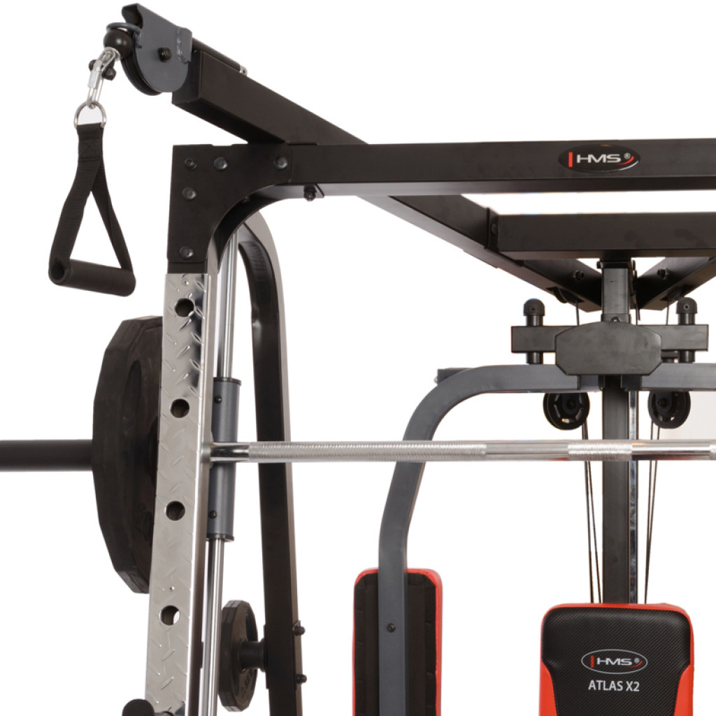 Multipress HMS X2 je najrozsiahlejšie zariadenie určené na komplexný tréning celého tela. Jeho univerzálnosť nahradí mnoho strojov bežnej posilňovne na jednom mieste. Kolejnice Atlasu sú skvelým zariadením pre silový rozvoj svalových partií. Vďaka plynulému chodu sú všetky cviky izolované a vedené v správnej polohe. Posilňovacie zariadenie X2 HMS zahŕňa - vodítka - modlitebník, motýlik, príťahy vrchnej aj spodnej kladky, predkopávanie. Také široké spektrum zariadení je ideálny stroj pre ľudí, ktorí zvažujú celkový rozvoj svalových partií. Hlavným prvkom celého Atlasu je odnímateľná posilňovacia lavica. Lavica má nastaviteľnú oporu a sedadlo vyrobené z odolného čalúnenia z uhlíkových vlákien. Veľká kvalita zariadenia multipressu HMS X2 zaručuje bezproblémovú prevádzku po dlhú dobu. Silné rámy skonštruované z kvalitnej ocele, systém kladiek a zariadenie pre napínanie lán spĺňa tie najvyššie technické a estetické normy. Všetkým odporúčame tento stroj na domáce použitie. **Funkcie:** - Bench press - Motýlik - Príťahy vrchnej kladky - Dolné príťahy - Predkopávanie - Modlitebník **Parametre:** - Rozmer po rozložení: - dĺžka: 242 cm - šírka: 205 cm - výška: 219 cm - Ložiská vo všetkých kladkách - Lineárne ložiská v posuvnom mechanizme - Úchyty na kotúče o priemere 25 a 50 mm - Multifunkčná, odnímateľná lavica - Odolné čalúnenie - Nastavenie napätia lan - Popruh na členok - Poistné body s bezpečnostným mechanizmom - Váha produktu: 191 kg - Maximálne zaťaženie produktu (závažia + užívateľ): 272 kg - Maximálne zaťaženie predkopávania: 45 kg - Maximálne zaťaženie vrchnej kladky: 90 kg - Maximálne zaťaženie: 135 kg **Upozornenie:** - Certifikát, norma: - Záruka: 24 mesiacov