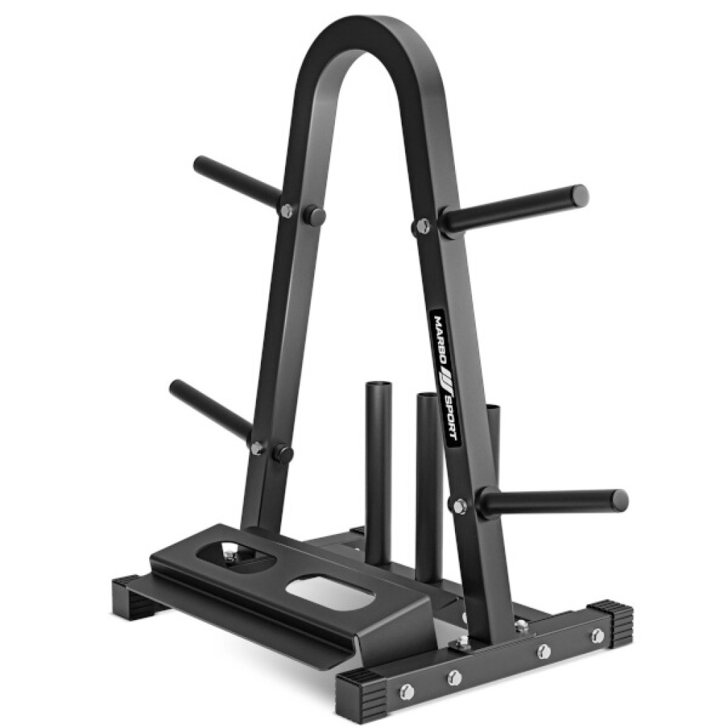 Stojan na závažia, činky a obojručné osi MARBO MH-S007 je ideálny pre udržanie poriadku a prehľadu v domácej posilňovni. Konštrukcia je vyrobená z oceľového profilu 40 x 40 milimetrov a dosahuje nosnosť 300 kilogramov. Na spodnú poličku je možné uskladniť 2 jednoručné činky. Na zadnej strane stojanu sú 3 zvislé tubusy s vnútorným priemerom 32 milimetrov, ktoré slúžia ako stojany pre obojručné osi s priemerom 28 alebo 30 milimetrov. 4 tŕne pre zavesenie závažia majú dĺžku 20 centimetrov a priemer 15 milimetrov. Koniec tŕňa je opatrený gumovým krúžkom, ktorý predchádza poškriabaniu konštrukcie.