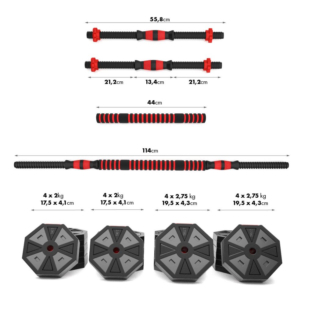Kotúče sú vyrobené z tvrdého plastu, ktorý je vyplnený cementom. Obojručná os je spojovacím dielom, do ktorého sa zaskrutkujú hriadele jednoručných činiek. Nakladacie tŕne sú opatrené závitom a závažie sa zaisťuje pomocou hviezdicových matíc. Šesťuholníkový tvar kotúčov navyše zabraňuje ich odvalovaniu. Činky sa vám tak nikam neodkotúľajú a budete ich mať vždy tam, kde ste ich odložili.