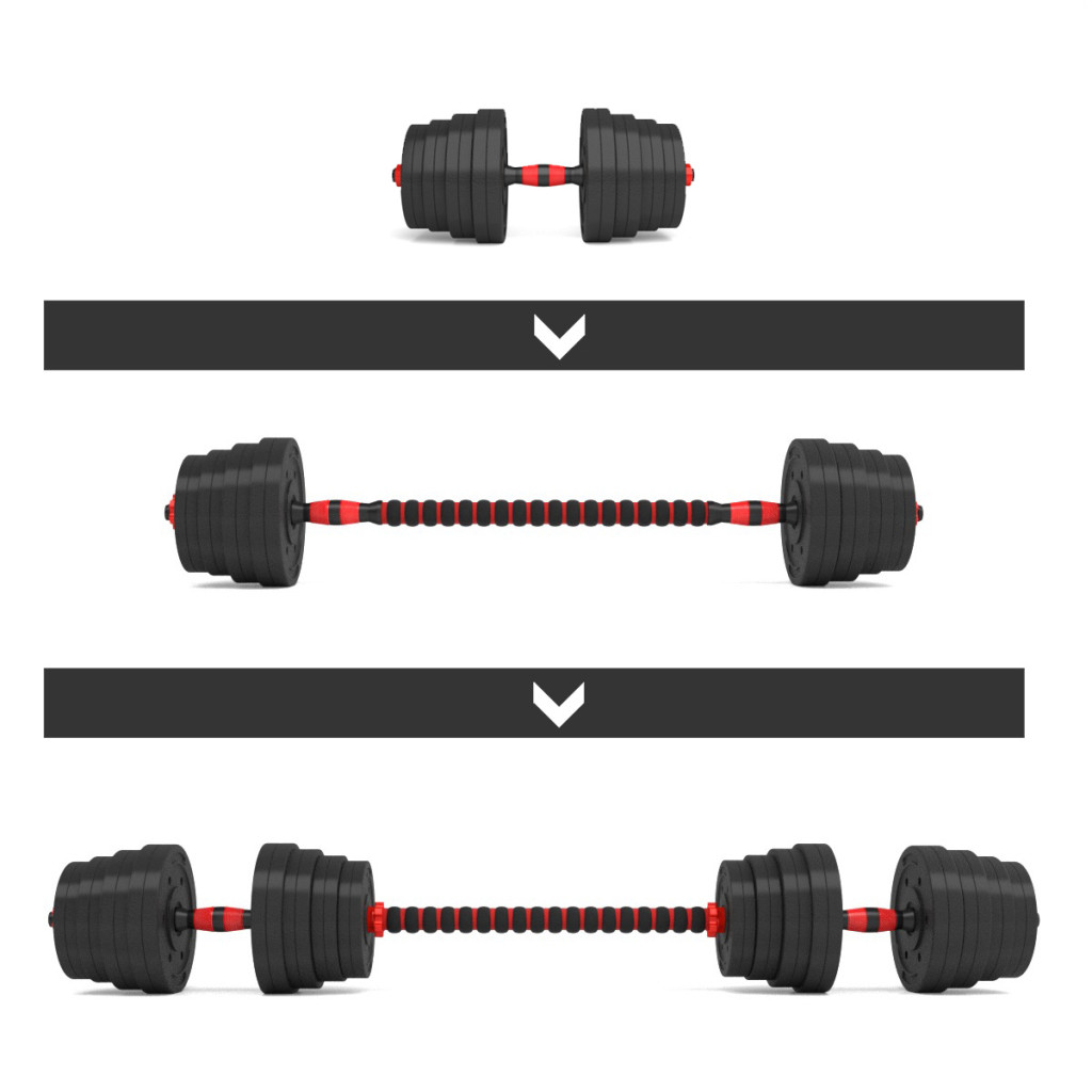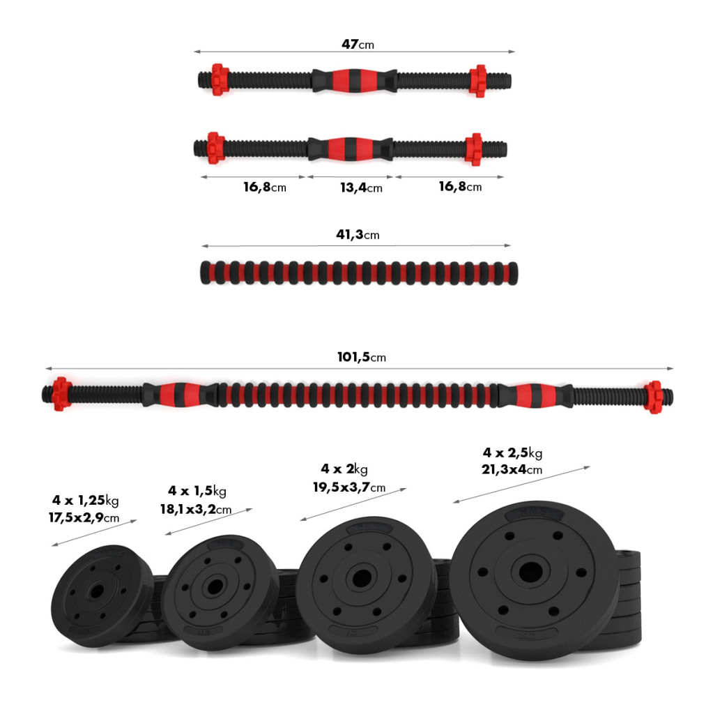 Kotúče sú vyrobené z tvrdého plastu, ktorý je vyplnený cementom. Obojručná os je spojovacím dielom, do ktorého sa zaskrutkujú hriadele jednoručných činiek. Nakladacie tŕne sú opatrené závitom a závažie sa zaistí pomocou hviezdicových matíc.