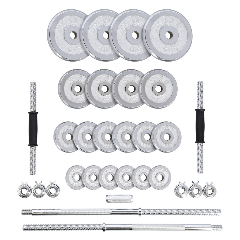 Obojručnú os tvoria tri časti, v podstate ide o 2 polovice, ktoré sa zaskrutkujú do stredného, vrúbkovaného dielu, čím vznikne klasická, obojručná os, ktorá sa od pevnej hriadele líši len nepatrne širším stredom. Súprava HMS STC50 je prvým modelom z našej ponuky, ktorý umožňuje toto riešenie, ktoré šetrí náklady a miesto vo Vašej domácej posilňovni. Súprava obsahuje 2 krátke, nakladacie osi opatrené ergonomickým úchopom, 2 časti obojručnej osi, spojovací diel, 6 zámkov a 20 kotúčov.