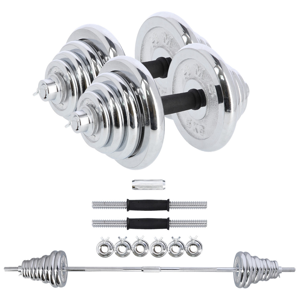 Činky sú vyrobené z vysoko kvalitnej, chrómovanej ocele, ktorá je zárukou dlhej životnosti. Kotúče sa proti posunutiu zabezpečujú skrutkovacími zámkami, ktoré sú dodatočne istené skrutkou s krídlovou maticou.