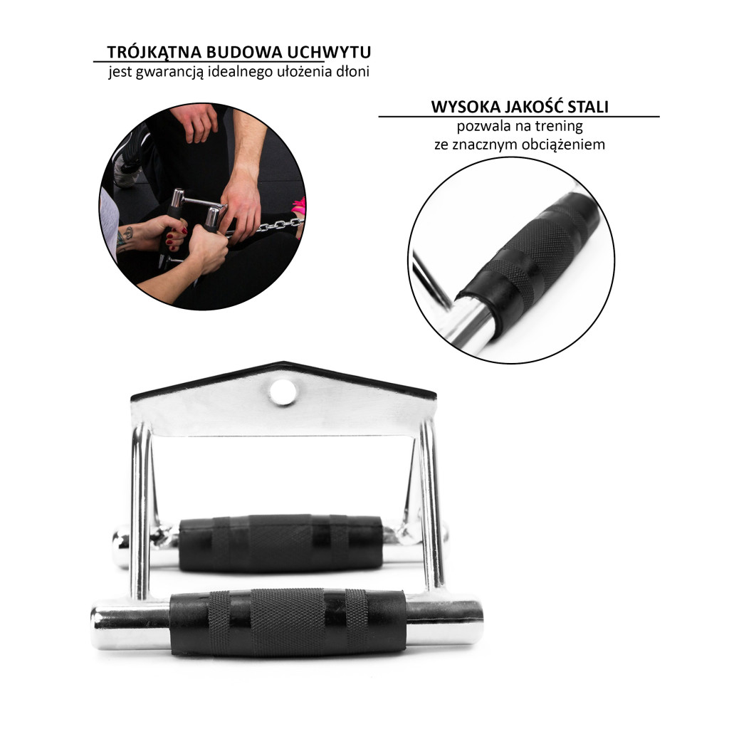 Trojuholníková konštrukcia úchopu zaručuje dokonalú polohu ruky a zároveň núti k správnemu pohybu pri cvičení. Pogumovaná rukoväť zabezpečuje bezpečné držanie a zabraňuje vykĺznutiu adaptéra z ruky a zároveň vyžaduje pevnejší úchop. Týmto spôsobom takisto pracujeme na rozvoji svalov predlaktia. Nie príliš široká rozteč rukovätí uľahčuje udržiavanie správnej dráhy pohybu, t.j. vedenie lakťov v blízkosti trupu. Adaptér UW04 je vyrobený z kvalitnej chrómovanej ocele, ktorá umožňuje tréning s výraznou záťažou.
