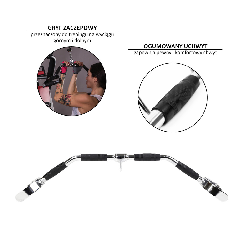 UW15 je vyrobený z vysoko kvalitnej ocele, čo vám dáva možnosť cvičiť so značnou záťažou. Jeho dĺžka a rozteč pogumovaných rukovätí zaručujú širokú škálu možností úchopu - od veľmi úzkeho až po veľmi široký. Adaptér tak umožní komplexné precvičenie svalov. Rukoväte sú na najširších miestach pod uhlom, čo napomáha priťahovaniu lakťov k trupu a tým udržanie lepšej techniky cvičenia. Počas cvičenia umožňuje UW15 zapojiť alternatívne svalové úpony v porovnaní s cvikmi s rovným adaptérom. Rukoväte opatrené gumou zabezpečujú bezpečný a pohodlný úchop bez obáv, že vám adaptér vykĺzne z rúk.