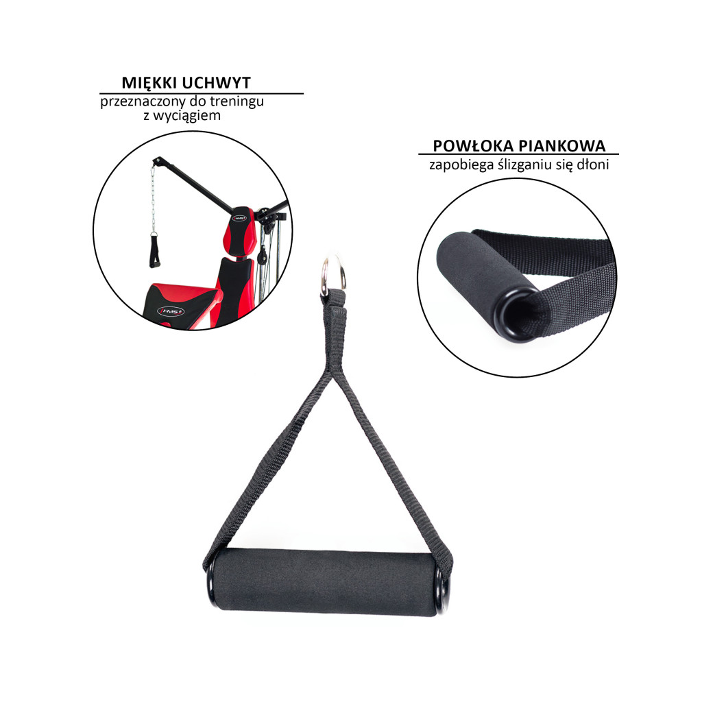 Úchyt na gumový expandér HMS je doplnkom k kladkovým strojom. Cvičenie s týmto expandérom je oveľa komfortnejšie vďaka pohodlným úchopom.