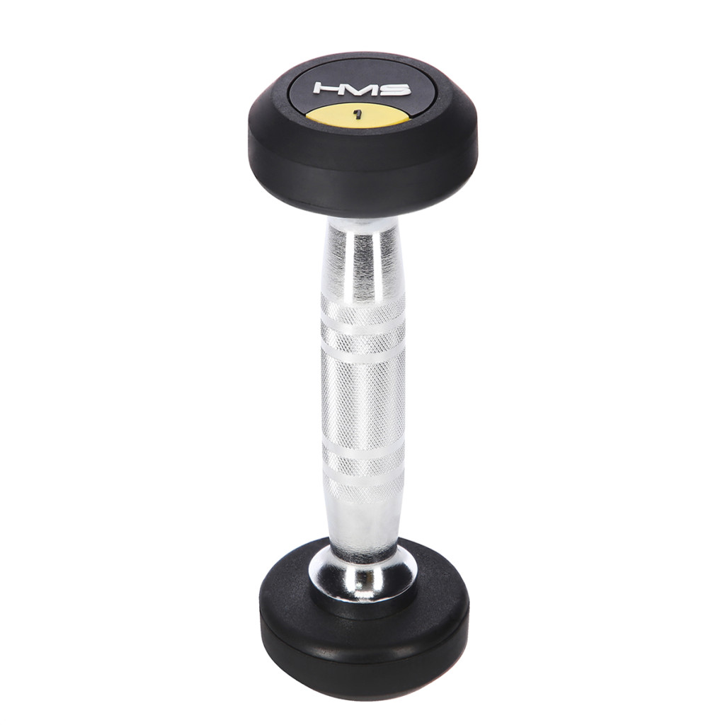 1 kilogramová jednoručná činka HMS HG Pro je určená na profesionálne použitie ako doma, tak v posilňovni. Závažie tvorí liatinový odliatok pokrytý silnou vrstvou gumy, ktorá ochráni činku aj podklad pred poškodením. Na čelnej strane je značka HMS a údaj o hmotnosti v kilogramoch. Rukoväť je vyrobená z chrómovanej ocele, pre pohodlný úchop má súdkovitý tvar s vrúbkovaným povrchom.