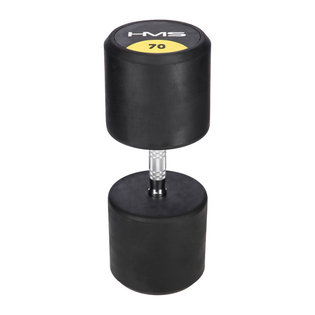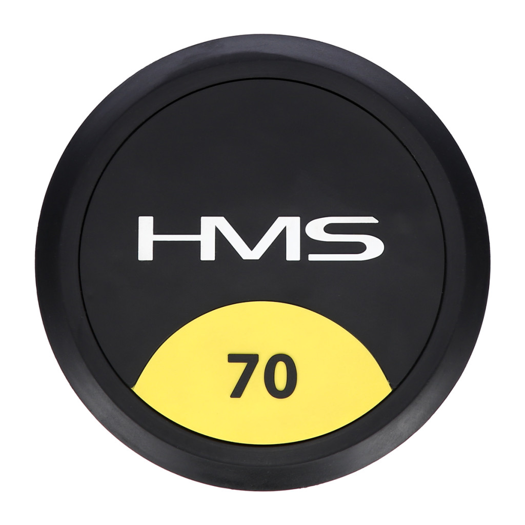 70-kilogramová jednoručná činka HMS HG Pro je určená na profesionálne použitie ako doma, tak v posilňovni. Závažie tvorí liatinový odliatok pokrytý silnou vrstvou gumy, ktorá ochráni ako činku, tak podklad pred poškodením. Na prednej strane je značka HMS a údaj o hmotnosti v kilogramoch. Rukoväť je vyrobená z chrómovanej ocele, na pohodlný úchop má súdkovitý tvar s vrúbkovaným povrchom.