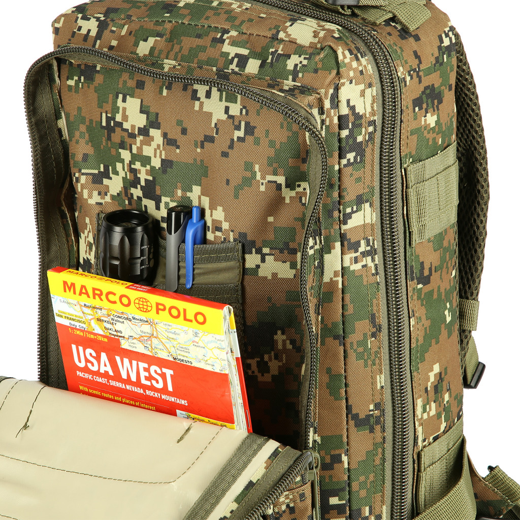 Model Defender má celkovo 4 komory o celkovom objeme 30 litrov. Všetky komory sú opatrené obojstranným zipsom. Hlavná komora má zips po takmer celom obvode a je možné ju úplne otvoriť pre pohodlný prístup, veko komory je opatrené sieťovinovým vreckom, do ktorého sa zmestí napríklad tablet. Prostredná komora obsahuje hlavný priestor napríklad pre dokumenty a mapu, na stene komory sú ďalej 2 vrecká napríklad pre ceruzky, perá, buzolu alebo baterku. Predná, horná komora je určená na menšie predmety ako je napríklad powerbanka alebo mobilný telefón. Predná dolná komora ponúka okrem hlavného priestoru aj ďalšiu radu vreciek na drobnosti. Na zadnej strane sa nachádza ešte jedno ploché vrecko na suchý zips.