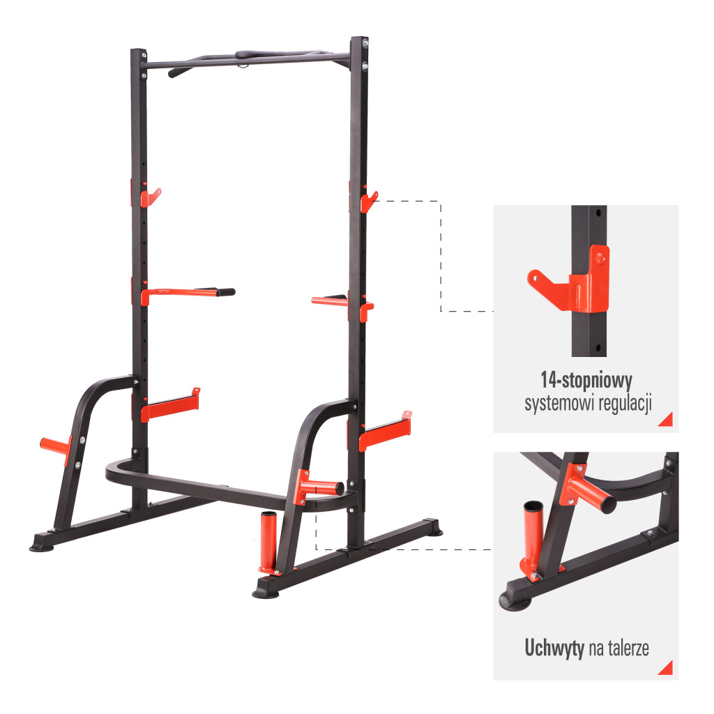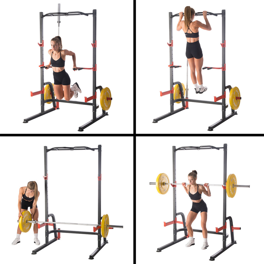 Celá konštrukcia je vyrobená z ocele, vďaka čomu je trvanlivá a odolná, rozmerná základňa umožňuje dynamický tréning aj pri veľkom zaťažení. Maximálna nosnosť stojana je 200 kg. Voľné závažia možno odkladať na 2 tŕne o dĺžke 16 centimetrov. Podpery pre dipy majú dvojité madlá a umožňujú prispôsobenie správnej polohy pre tréning. Tvarovaná hrazda ponúka 4 páry rôznych úchopov. Stabilizátory sú osadené koncovkami, ktoré chránia konštrukciu a podlahu pred poškodením a zároveň zvyšujú stabilitu stojana.