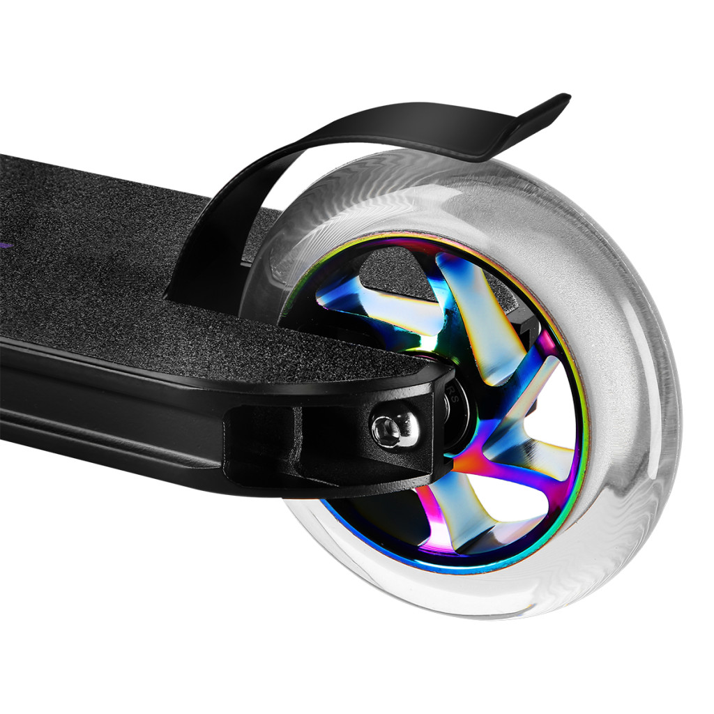 HS024 PRO je ideálny na asfaltový povrch a spevnené chodníky, nezľakne sa ale ani skateparku alebo U-rampy. Kolieska s rozmermi 110 x 24 mm s ložiskami ABEC9 zaručujú rýchlu a svižnú jazdu bez zbytočne vynaloženej námahy. Zadná nášľapná brzda flex fender zase zaisťuje maximálnu bezpečnosť používania a umožňuje okamžité zastavenie kolobežky.