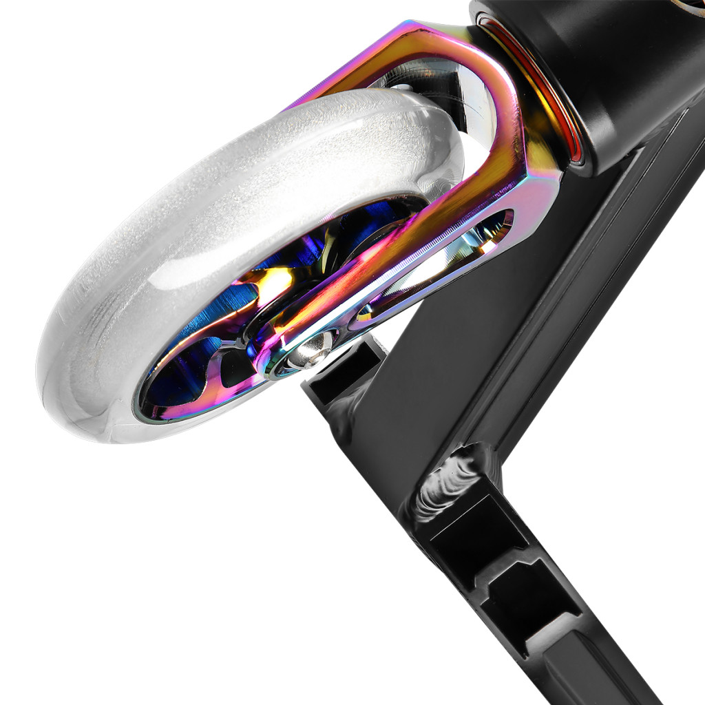 Freestylová kolobežka nemá žiadny skladací mechanizmus ani systém nastavenia výšky riadidiel - tieto typy riešení by mohli oslabiť celú konštrukciu, čo samozrejme nie je žiaduce pri produkte, kde je odolnosť zásadná. Pri prevádzaní trikov sa konštrukcia stretáva s veľmi vysokým zaťažením. Vďaka použitiu pevnej ocele a silného hliníka je takmer nemožné kolobežku HS024 PRO dostať na limit a tak môžete aj zložité a náročné triky vykonávať s maximálnou istotou.