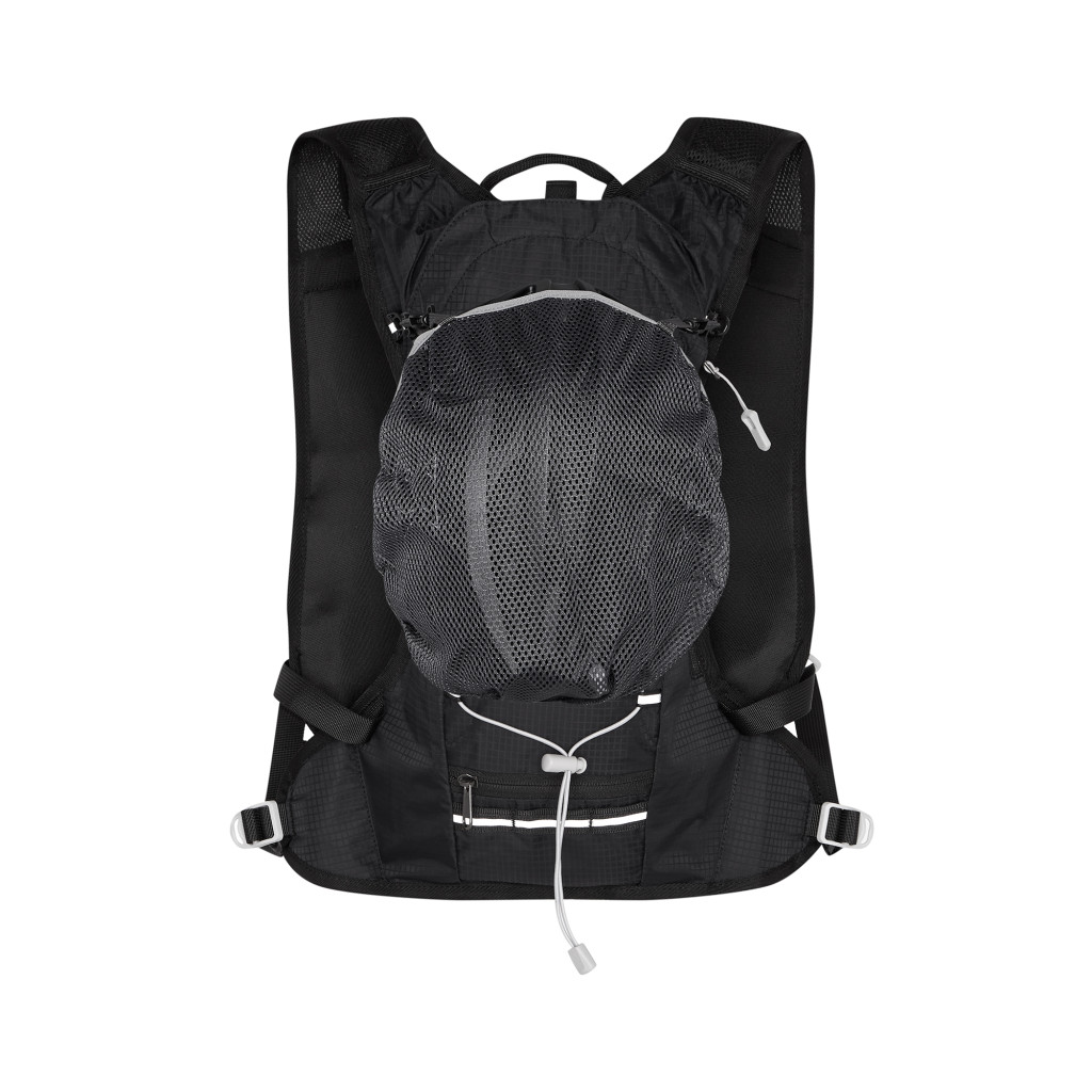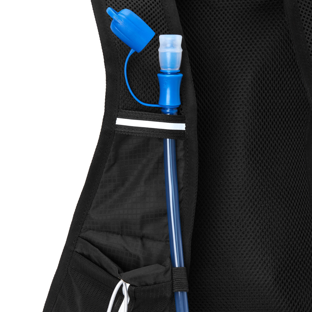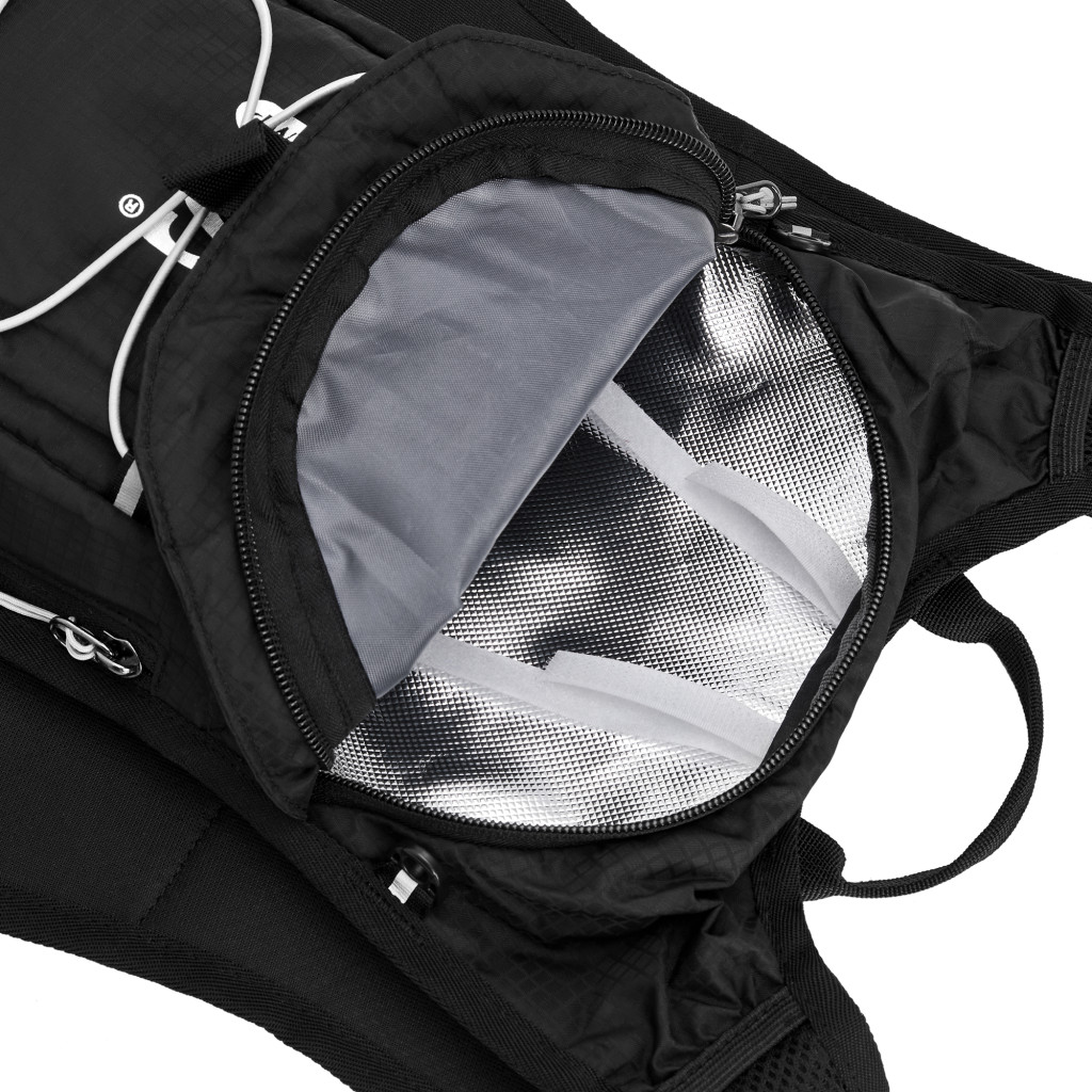 Hlavná komora batohu je vybavená prepážkou, v hornej časti sa nachádzajú 2 suché zipsy na zavesenie hydrovaku (nie je súčasťou dodávky). Zadná strana hlavnej komory je opatrená hliníkovou fóliou, ktorá slúži ako izolácia medzi hydrovakom a chrbtom, takže nápoj sa nebude ohrievať teplom od chrbta. Hadičku hydrovaku je možné vyviesť prievlakmi na pravej aj na ľavej strane pod ramennými panelmi. Predná strana batohu je opatrená gumovým lankom s brzdičkou, pod ktoré je možné uložiť napríklad karimatku. Nižšie nájdeme vrecko, v ktorom sa skrýva sieťka, ktorú je možné vytiahnuť a pomocou karabínok pripnúť k stranám batohu, sieťka následne vytvorí vrecko, čo ktoré môžeme uložiť napríklad cyklistickú helmu, ešus a pod.. Pod vreckom je reflexný panel, ku ktorému si môžeme pripnúť ďalšie vybavenie. Na pravej strane sa skrýva ďalšie vrecko na zips, ktoré je ideálne pre telefón, peňaženku, alebo napríklad kľúče. Na hornej strane batohu je pútko pre ľahké prenášanie batohu v ruke. Chrbát a ramenné popruhy sú vyrobené zo sieťoviny doplnené o priedušnú penu, ktorá zvyšuje priedušnosť panelu a chrbát sa bude menej potiť. Ramenné popruhy sú opatrené reflexnými remienkami na pretiahnutie hadičky od hydrovaku a vreckami zo sieťoviny. Na ľavom popruhu sa navyše nachádza vrecko s priehľadnou čelnou stranou, do ktorej je možné uložiť napríklad kartičku pre prípad straty, štartové číslo a podobne. Ramenné popruhy sú spojené hrudným pásom, ktorý je možné výškovo nastaviť. Popruh je spojený plastovou prackou s píšťalkou.