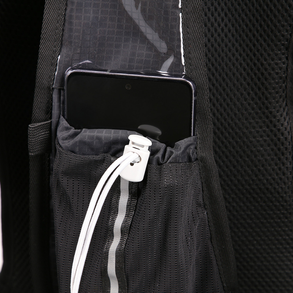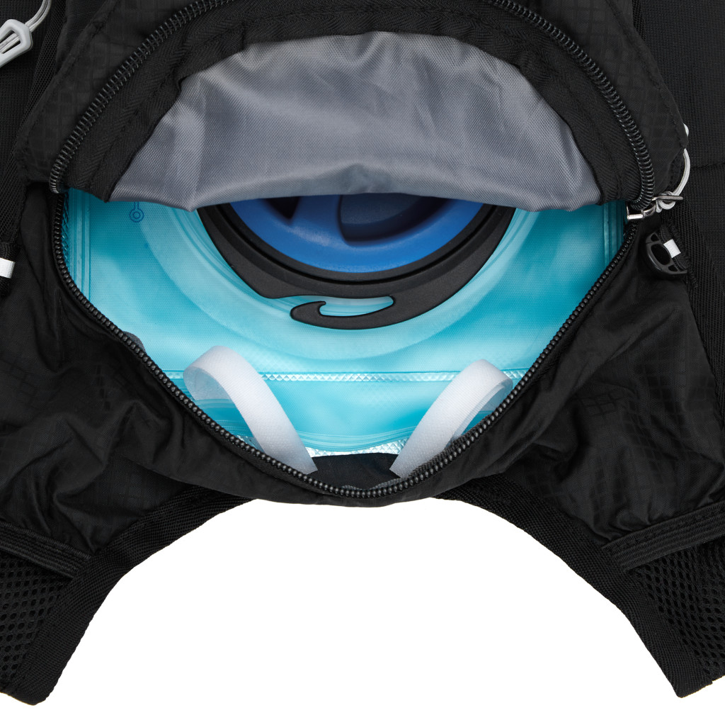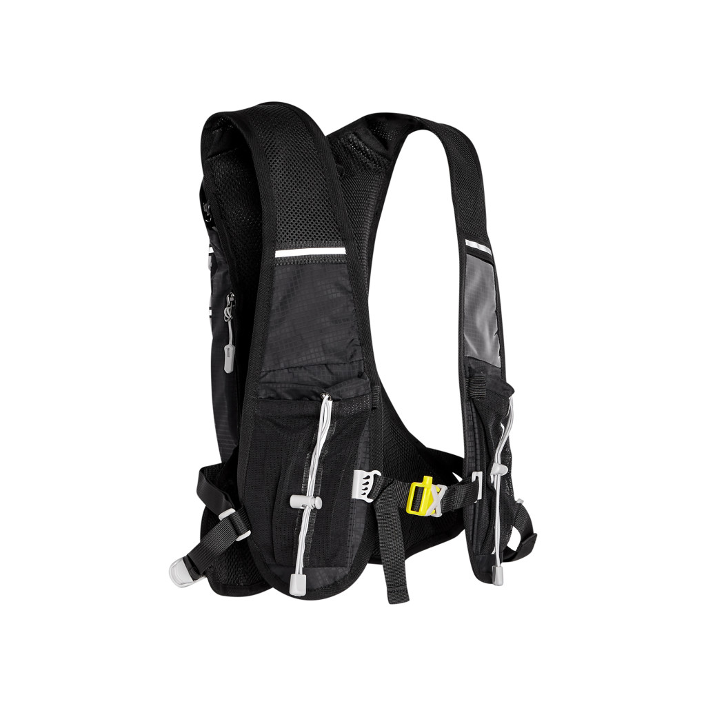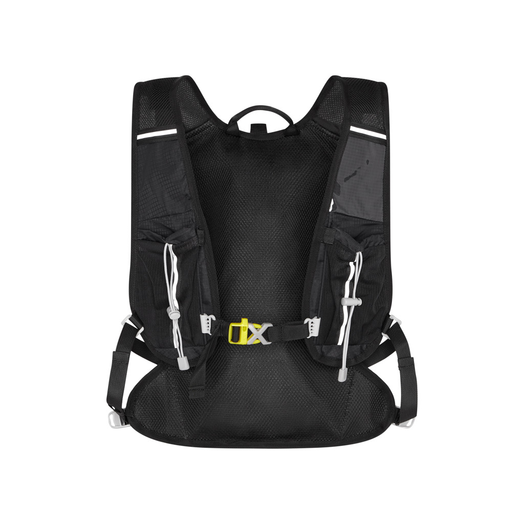 Hlavná komora batohu je vybavená prepážkou, v hornej časti sa nachádzajú 2 suché zipsy na zavesenie hydrovaku (nie je súčasťou dodávky). Zadná strana hlavnej komory je opatrená hliníkovou fóliou, ktorá slúži ako izolácia medzi hydrovakom a chrbtom, takže nápoj sa nebude ohrievať teplom od chrbta. Hadičku hydrovaku je možné vyviesť prievlakmi na pravej aj na ľavej strane pod ramennými panelmi. Predná strana batohu je opatrená gumovým lankom s brzdičkou, pod ktoré je možné uložiť napríklad karimatku. Nižšie nájdeme vrecko, v ktorom sa skrýva sieťka, ktorú je možné vytiahnuť a pomocou karabínok pripnúť k stranám batohu, sieťka následne vytvorí vrecko, čo ktoré môžeme uložiť napríklad cyklistickú helmu, ešus a pod.. Pod vreckom je reflexný panel, ku ktorému si môžeme pripnúť ďalšie vybavenie. Na pravej strane sa skrýva ďalšie vrecko na zips, ktoré je ideálne pre telefón, peňaženku, alebo napríklad kľúče. Na hornej strane batohu je pútko pre ľahké prenášanie batohu v ruke. Chrbát a ramenné popruhy sú vyrobené zo sieťoviny doplnené o priedušnú penu, ktorá zvyšuje priedušnosť panelu a chrbát sa bude menej potiť. Ramenné popruhy sú opatrené reflexnými remienkami na pretiahnutie hadičky od hydrovaku a vreckami zo sieťoviny. Na ľavom popruhu sa navyše nachádza vrecko s priehľadnou čelnou stranou, do ktorej je možné uložiť napríklad kartičku pre prípad straty, štartové číslo a podobne. Ramenné popruhy sú spojené hrudným pásom, ktorý je možné výškovo nastaviť. Popruh je spojený plastovou prackou s píšťalkou.