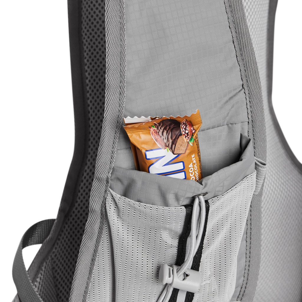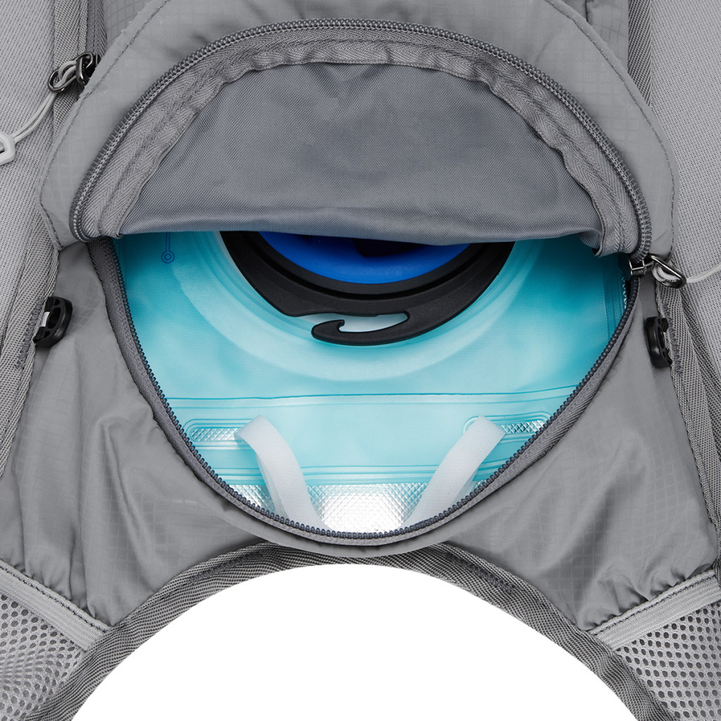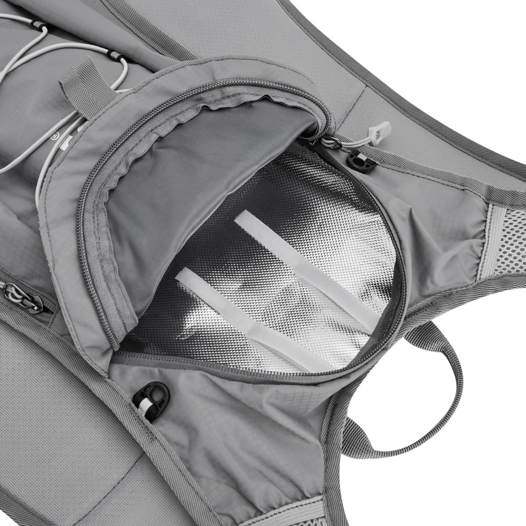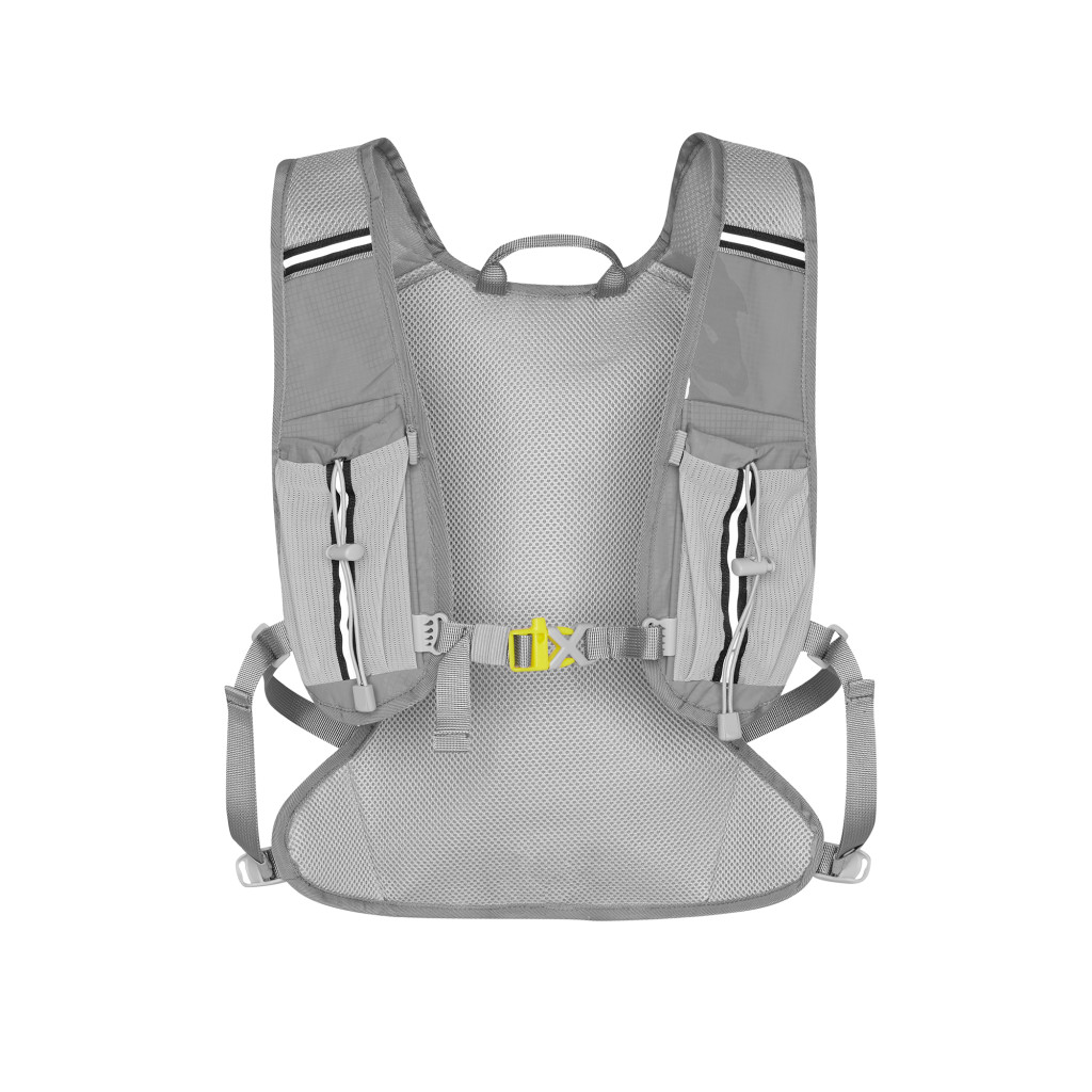 Hlavná komora batohu je vybavená prepážkou, v hornej časti sa nachádzajú 2 suché zipsy na zavesenie hydrovaku (nie je súčasťou dodávky). Zadná strana hlavnej komory je opatrená hliníkovou fóliou, ktorá slúži ako izolácia medzi hydrovakom a chrbtom, takže nápoj sa nebude ohrievať teplom od chrbta. Hadičku hydrovaku je možné vyviesť prievlakmi na pravej aj na ľavej strane pod ramennými panelmi. Predná strana batohu je opatrená gumovým lankom s brzdičkou, pod ktoré je možné uložiť napríklad karimatku. Nižšie nájdeme vrecko, v ktorom sa skrýva sieťka, ktorú je možné vytiahnuť a pomocou karabínok pripnúť k stranám batohu, sieťka následne vytvorí vrecko, čo ktoré môžeme uložiť napríklad cyklistickú helmu, ešus a pod.. Pod vreckom je reflexný panel, ku ktorému si môžeme pripnúť ďalšie vybavenie. Na pravej strane sa skrýva ďalšie vrecko na zips, ktoré je ideálne pre telefón, peňaženku, alebo napríklad kľúče. Na hornej strane batohu je pútko pre ľahké prenášanie batohu v ruke. Chrbát a ramenné popruhy sú vyrobené zo sieťoviny doplnené o priedušnú penu, ktorá zvyšuje priedušnosť panelu a chrbát sa bude menej potiť. Ramenné popruhy sú opatrené reflexnými remienkami na pretiahnutie hadičky od hydrovaku a vreckami zo sieťoviny. Na ľavom popruhu sa navyše nachádza vrecko s priehľadnou čelnou stranou, do ktorej je možné uložiť napríklad kartičku pre prípad straty, štartové číslo a podobne. Ramenné popruhy sú spojené hrudným pásom, ktorý je možné výškovo nastaviť. Popruh je spojený plastovou prackou s píšťalkou.