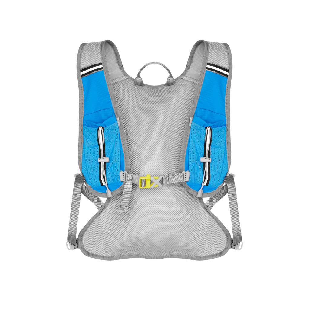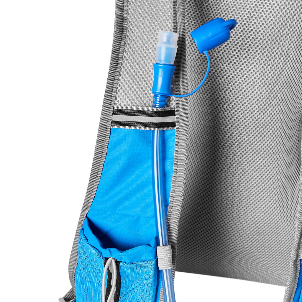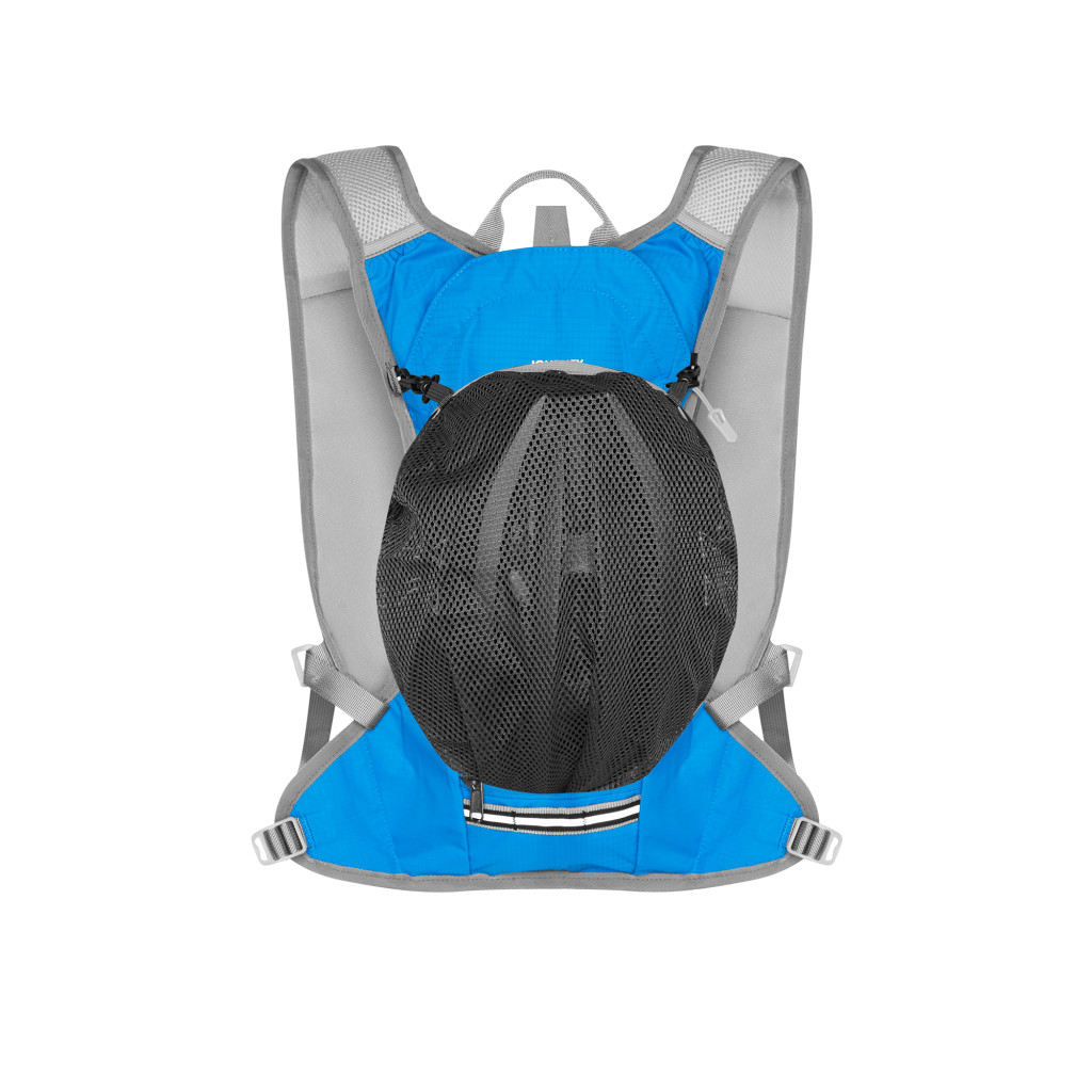 Hlavná komora batohu je vybavená prepážkou, v hornej časti sa nachádzajú 2 suché zipsy na zavesenie hydrovaku (nie je súčasťou dodávky). Zadná strana hlavnej komory je opatrená hliníkovou fóliou, ktorá slúži ako izolácia medzi hydrovakom a chrbtom, takže nápoj sa nebude ohrievať teplom od chrbta. Hadičku hydrovaku je možné vyviesť prievlakmi na pravej aj na ľavej strane pod ramennými panelmi. Predná strana batohu je opatrená gumovým lankom s brzdičkou, pod ktoré je možné uložiť napríklad karimatku. Nižšie nájdeme vrecko, v ktorom sa skrýva sieťka, ktorú je možné vytiahnuť a pomocou karabínok pripnúť k stranám batohu, sieťka následne vytvorí vrecko, čo ktoré môžeme uložiť napríklad cyklistickú helmu, ešus a pod.. Pod vreckom je reflexný panel, ku ktorému si môžeme pripnúť ďalšie vybavenie. Na pravej strane sa skrýva ďalšie vrecko na zips, ktoré je ideálne pre telefón, peňaženku, alebo napríklad kľúče. Na hornej strane batohu je pútko pre ľahké prenášanie batohu v ruke. Chrbát a ramenné popruhy sú vyrobené zo sieťoviny doplnené o priedušnú penu, ktorá zvyšuje priedušnosť panelu a chrbát sa bude menej potiť. Ramenné popruhy sú opatrené reflexnými remienkami na pretiahnutie hadičky od hydrovaku a vreckami zo sieťoviny. Na ľavom popruhu sa navyše nachádza vrecko s priehľadnou čelnou stranou, do ktorej je možné uložiť napríklad kartičku pre prípad straty, štartové číslo a podobne. Ramenné popruhy sú spojené hrudným pásom, ktorý je možné výškovo nastaviť. Popruh je spojený plastovou prackou s píšťalkou.