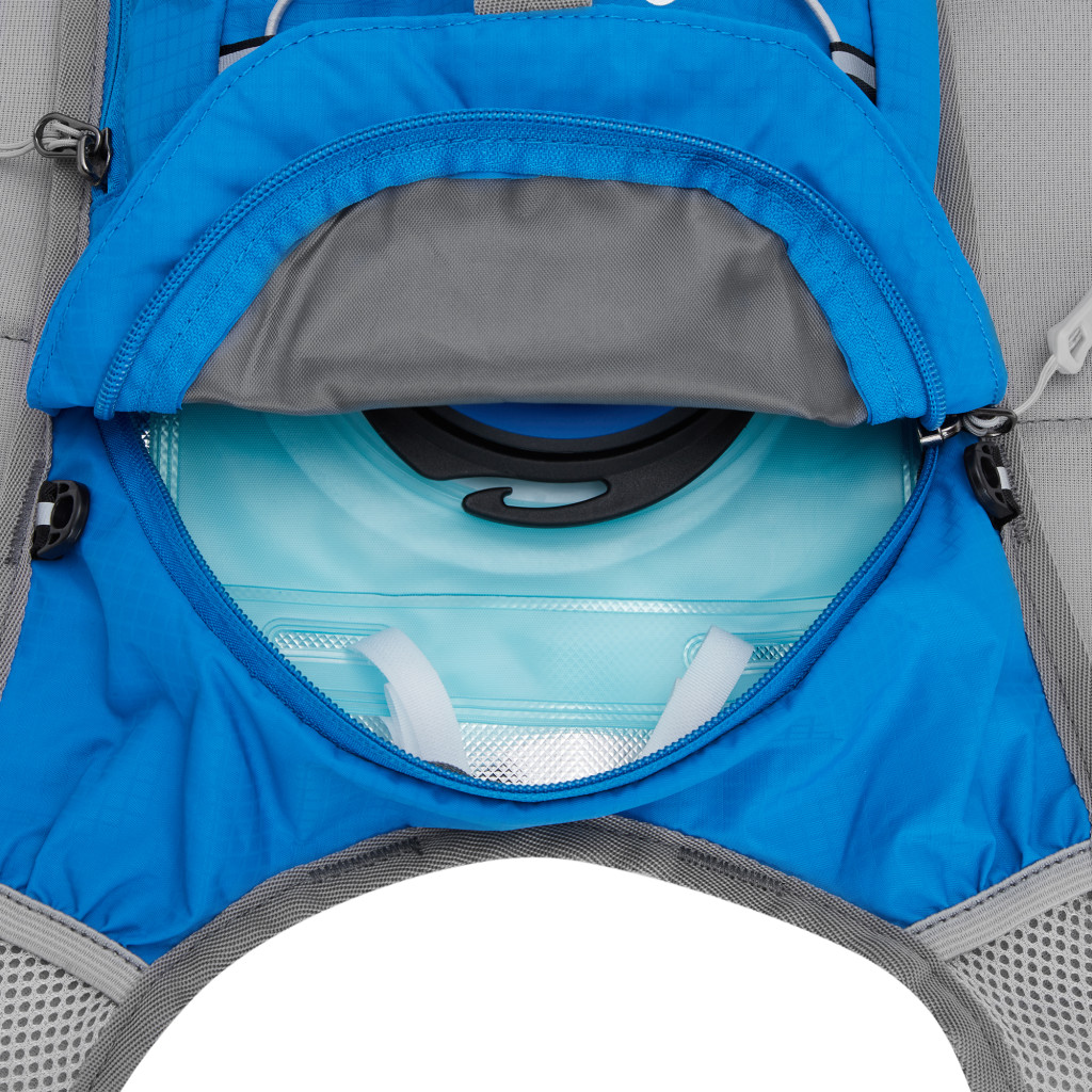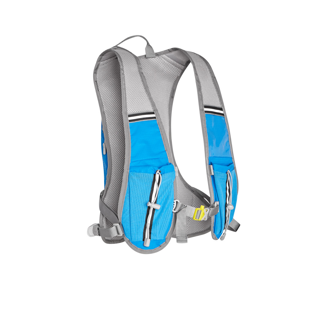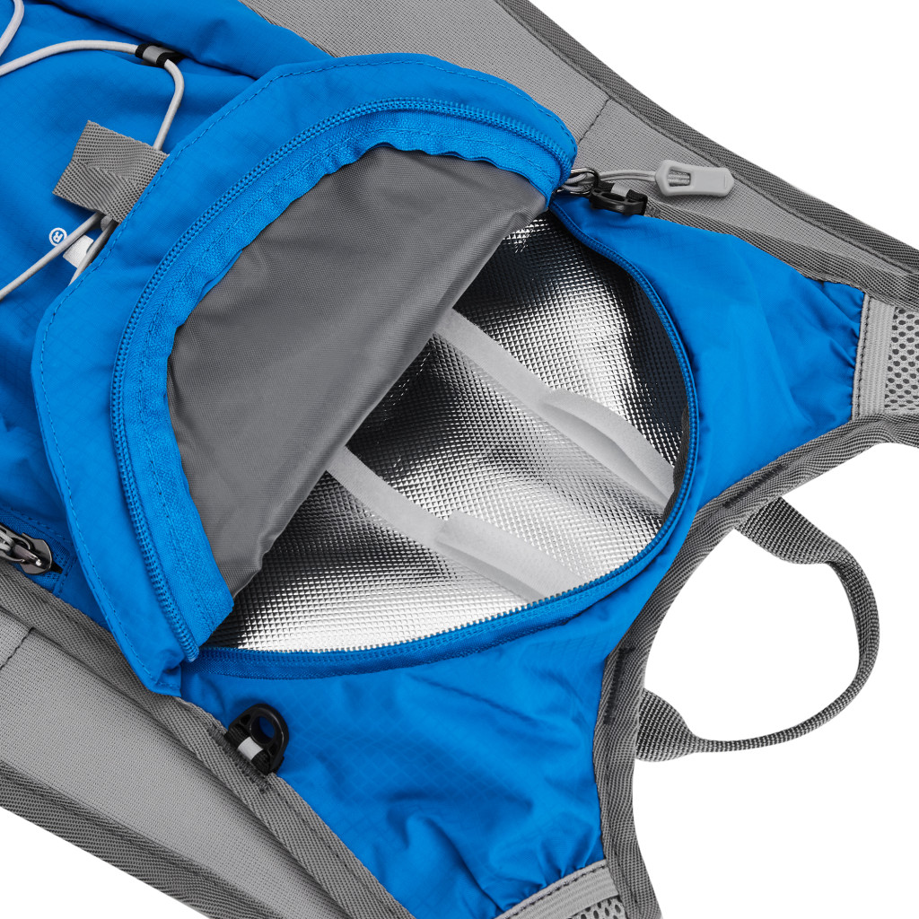 Hlavná komora batohu je vybavená prepážkou, v hornej časti sa nachádzajú 2 suché zipsy na zavesenie hydrovaku (nie je súčasťou dodávky). Zadná strana hlavnej komory je opatrená hliníkovou fóliou, ktorá slúži ako izolácia medzi hydrovakom a chrbtom, takže nápoj sa nebude ohrievať teplom od chrbta. Hadičku hydrovaku je možné vyviesť prievlakmi na pravej aj na ľavej strane pod ramennými panelmi. Predná strana batohu je opatrená gumovým lankom s brzdičkou, pod ktoré je možné uložiť napríklad karimatku. Nižšie nájdeme vrecko, v ktorom sa skrýva sieťka, ktorú je možné vytiahnuť a pomocou karabínok pripnúť k stranám batohu, sieťka následne vytvorí vrecko, čo ktoré môžeme uložiť napríklad cyklistickú helmu, ešus a pod.. Pod vreckom je reflexný panel, ku ktorému si môžeme pripnúť ďalšie vybavenie. Na pravej strane sa skrýva ďalšie vrecko na zips, ktoré je ideálne pre telefón, peňaženku, alebo napríklad kľúče. Na hornej strane batohu je pútko pre ľahké prenášanie batohu v ruke. Chrbát a ramenné popruhy sú vyrobené zo sieťoviny doplnené o priedušnú penu, ktorá zvyšuje priedušnosť panelu a chrbát sa bude menej potiť. Ramenné popruhy sú opatrené reflexnými remienkami na pretiahnutie hadičky od hydrovaku a vreckami zo sieťoviny. Na ľavom popruhu sa navyše nachádza vrecko s priehľadnou čelnou stranou, do ktorej je možné uložiť napríklad kartičku pre prípad straty, štartové číslo a podobne. Ramenné popruhy sú spojené hrudným pásom, ktorý je možné výškovo nastaviť. Popruh je spojený plastovou prackou s píšťalkou.
