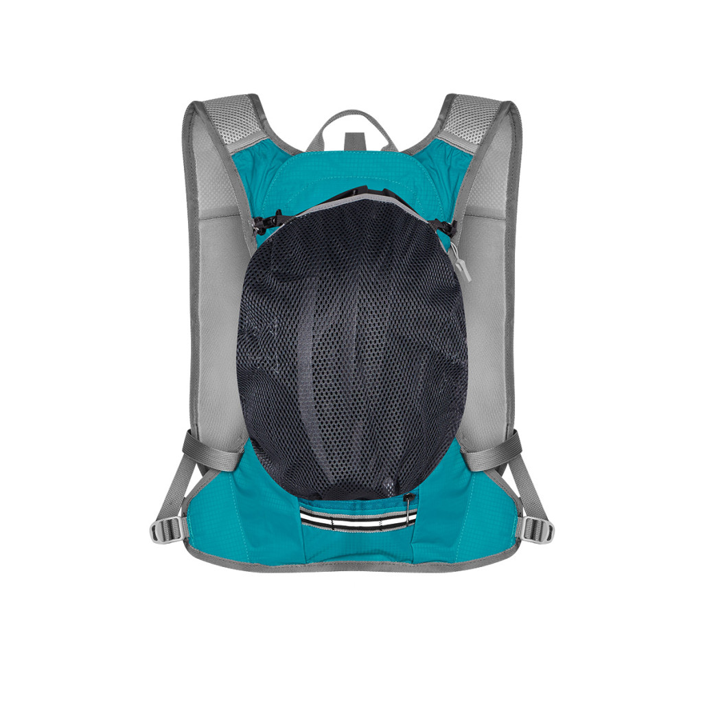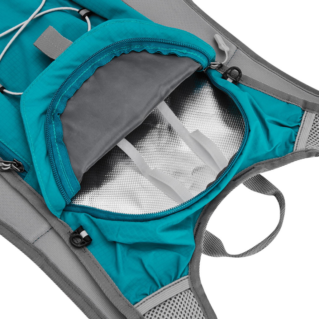 Hlavná komora batohu je vybavená prepážkou, v hornej časti sa nachádzajú 2 suché zipsy na zavesenie hydrovaku (nie je súčasťou dodávky). Zadná strana hlavnej komory je opatrená hliníkovou fóliou, ktorá slúži ako izolácia medzi hydrovakom a chrbtom, takže nápoj sa nebude ohrievať teplom od chrbta. Hadičku hydrovaku je možné vyviesť prievlakmi na pravej aj na ľavej strane pod ramennými panelmi. Predná strana batohu je opatrená gumovým lankom s brzdičkou, pod ktoré je možné uložiť napríklad karimatku. Nižšie nájdeme vrecko, v ktorom sa skrýva sieťka, ktorú je možné vytiahnuť a pomocou karabínok pripnúť k stranám batohu, sieťka následne vytvorí vrecko, čo ktoré môžeme uložiť napríklad cyklistickú helmu, ešus a pod.. Pod vreckom je reflexný panel, ku ktorému si môžeme pripnúť ďalšie vybavenie. Na pravej strane sa skrýva ďalšie vrecko na zips, ktoré je ideálne pre telefón, peňaženku, alebo napríklad kľúče. Na hornej strane batohu je pútko pre ľahké prenášanie batohu v ruke. Chrbát a ramenné popruhy sú vyrobené zo sieťoviny doplnené o priedušnú penu, ktorá zvyšuje priedušnosť panelu a chrbát sa bude menej potiť. Ramenné popruhy sú opatrené reflexnými remienkami na pretiahnutie hadičky od hydrovaku a vreckami zo sieťoviny. Na ľavom popruhu sa navyše nachádza vrecko s priehľadnou čelnou stranou, do ktorej je možné uložiť napríklad kartičku pre prípad straty, štartové číslo a podobne. Ramenné popruhy sú spojené hrudným pásom, ktorý je možné výškovo nastaviť. Popruh je spojený plastovou prackou s píšťalkou.