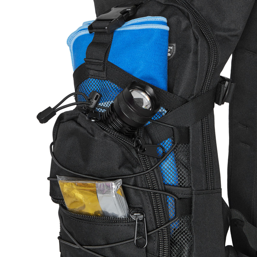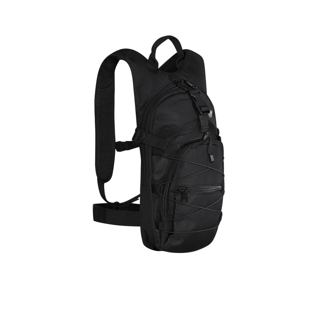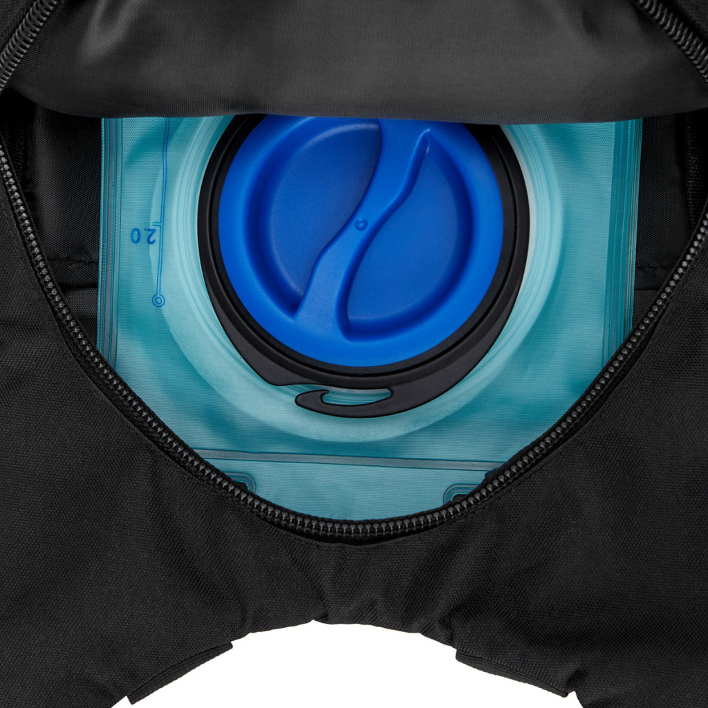 Hlavná komora batohu je vybavená prepážkou, v hornej časti sa nachádzajú 2 karabíny na zavesenie hydrovaku (nie je súčasťou dodávky). Hadičku hydrovaku je možné vyviesť prievlakmi na pravej aj na ľavej strane pod ramennými panelmi. Na hlavnej komore sa nachádzajú ďalšie úložné priestory a to veľké sieťované vrecko s popruhom a prackou - menšie otvorené, sieťované vrecko - 2. komora na zips - vrecko na zips (napríklad pre mobilný telefón a peňaženku) a gumová šnúra s brzdičkou, pod ktorou je možné prenášať napríklad cyklistickú helmu, alebo karimatku. Po stranách batohu sa nachádzajú kompresné popruhy, ktoré sťahujú hlavnú komoru a obe sieťované vrecká. Na hornej strane je robustné ucho na pohodlné prenášanie batohu v ruke. Zadná strana a ramenné popruhy sú polyesterové bez polstrovania. Na popruhoch je gumové pútko na prevlečenie hadičky hydrovaku a hrudný popruh, ten je výškovo a dĺžkovo nastaviteľný. Bedrový popruh s robustnou prackou má šírku 3,5 centimetra.