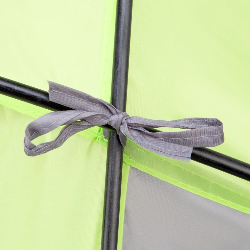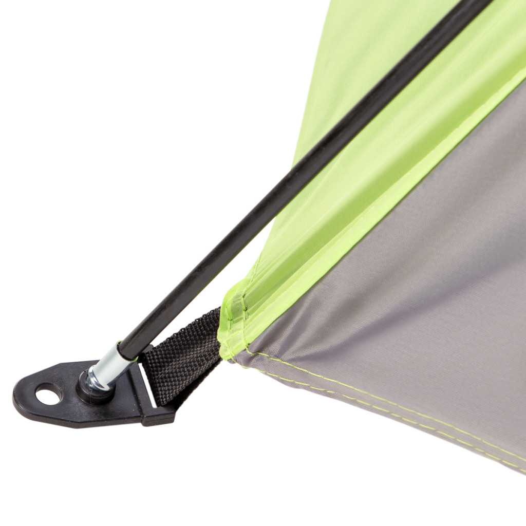 Stan je dodávaný zložený v taške opatrenej uchom pre ľahké prenášanie. Po vytiahnutí z tašky sa stan postaví s pomocou troch sklolaminátových tyčí, ktoré sa prevlečú tunelmi na polyesterovom tropiku. Podlaha s rozmermi 105 x 210 cm a výška 110 cm umožňujú úkryt pred slnkom ako deťom, tak rodičom. Použitý materiál odolá aj malej, dažďovej prehánke.