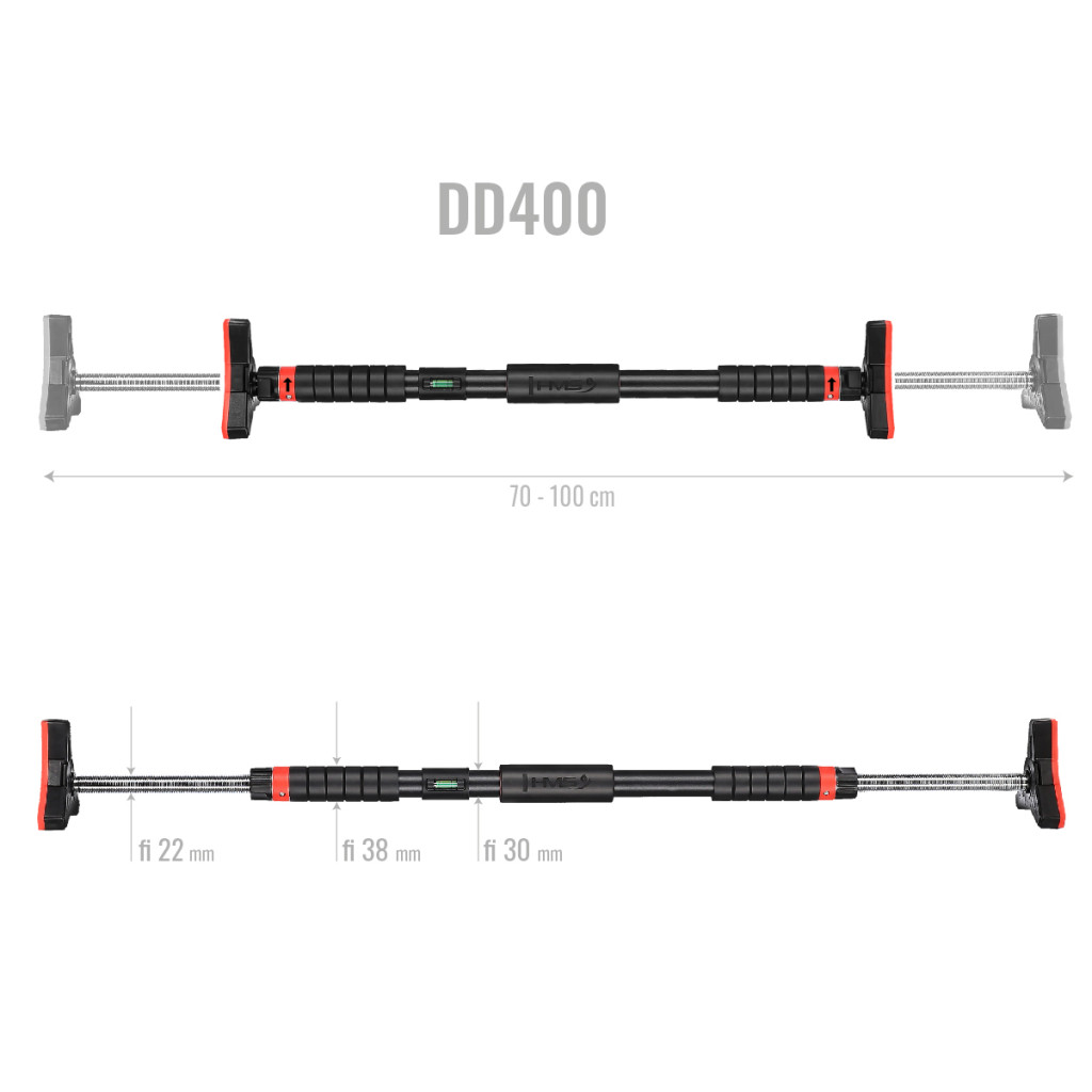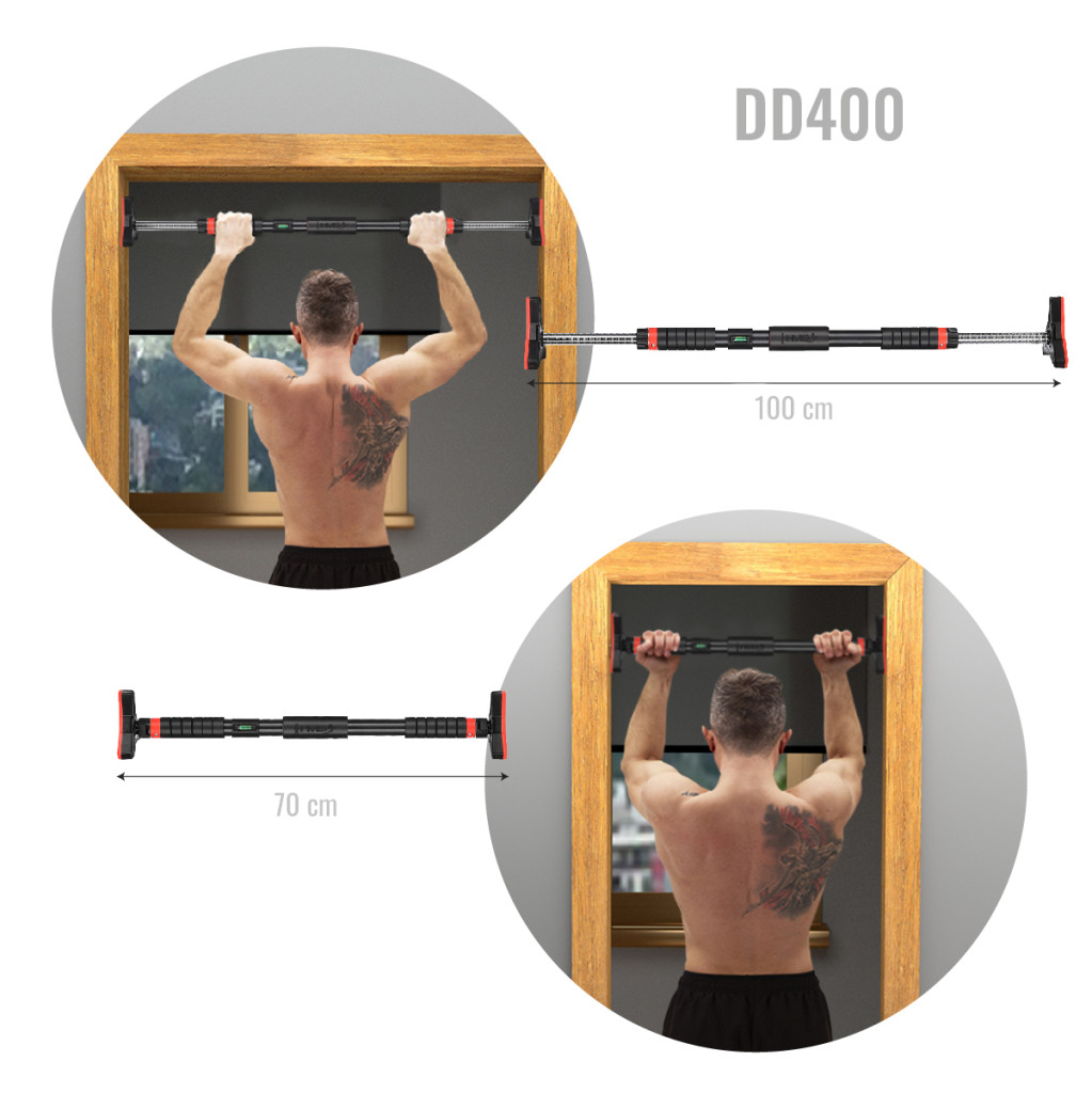 Po vytiahnutí hrazdy z balenia sa na jej konce nasadia koncovky. Hrazdu si na zemi roztiahneme tak, aby bola o niekoľko centimetrov kratšia, než je šírka zárubní a dotiahnutím čiernych matíc zaistíme dĺžku hrazdy. DD400 vložíme do zárubní, pomocou dodávanej vodováhy ju vyrovnáme a dotiahneme čierne matice. Akonáhle hrazda drží, tak si z koncoviek vytiahneme kľúč, ktorý si predĺžime pomocou nástavca a následne dotiahneme čierne matice tak, aby hrazda pevne držala. Nadstavec a vodováhu si uschováme na ďalšie použitie, kľúče nacvakneme späť do koncoviek a môžeme začať s tréningom.