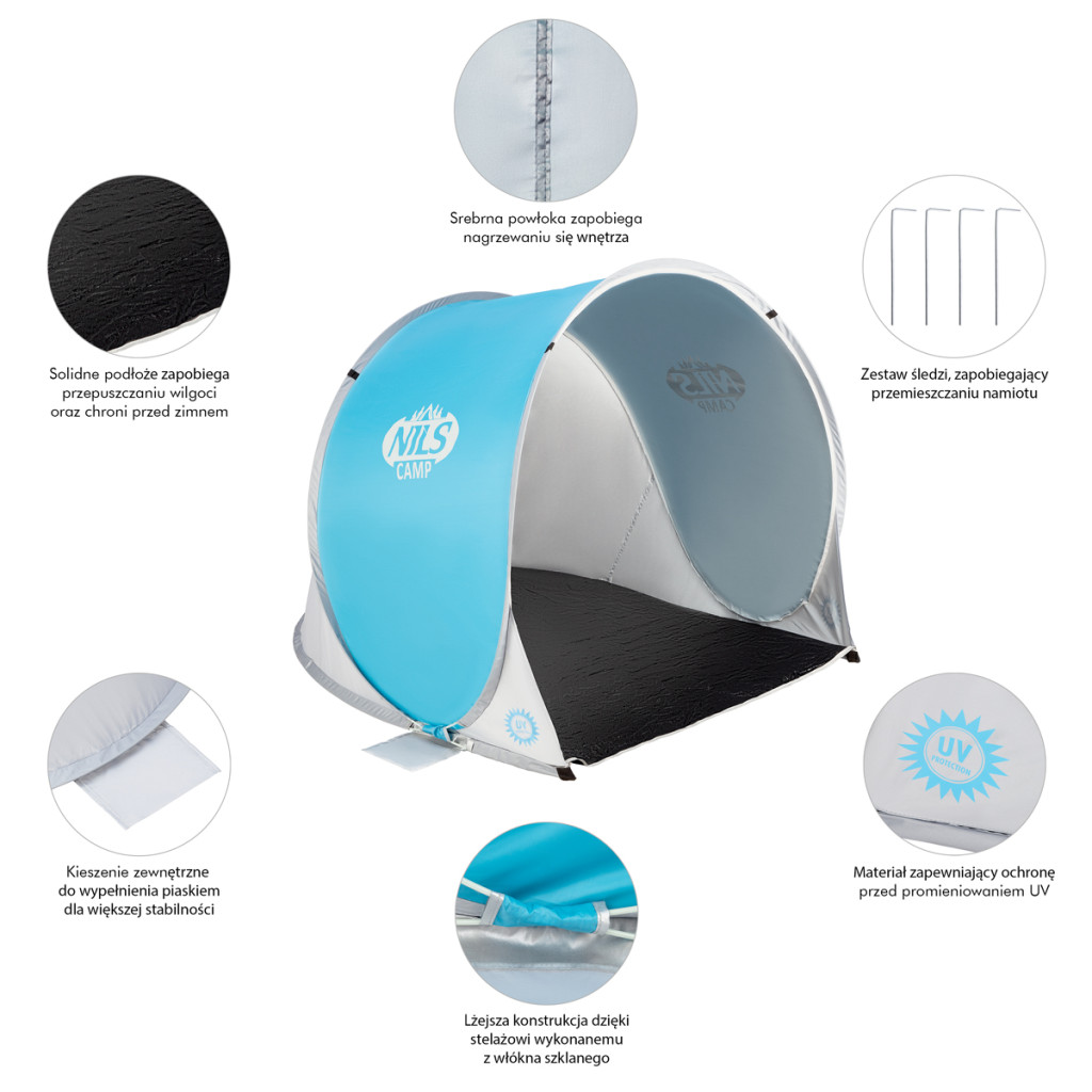 Plážový stan NILS Camp NC3173 využijete nielen počas dovolenky pri mori, ale tiež na verejnom kúpalisku alebo pri bazéne na záhrade. Stan NC3173 sa okamžite rozloží, je odolný a funkčný, ale predovšetkým poskytne účinnú ochranu pred slnečnými lúčmi, poskytne tieň a zároveň úkryt pred vetrom.