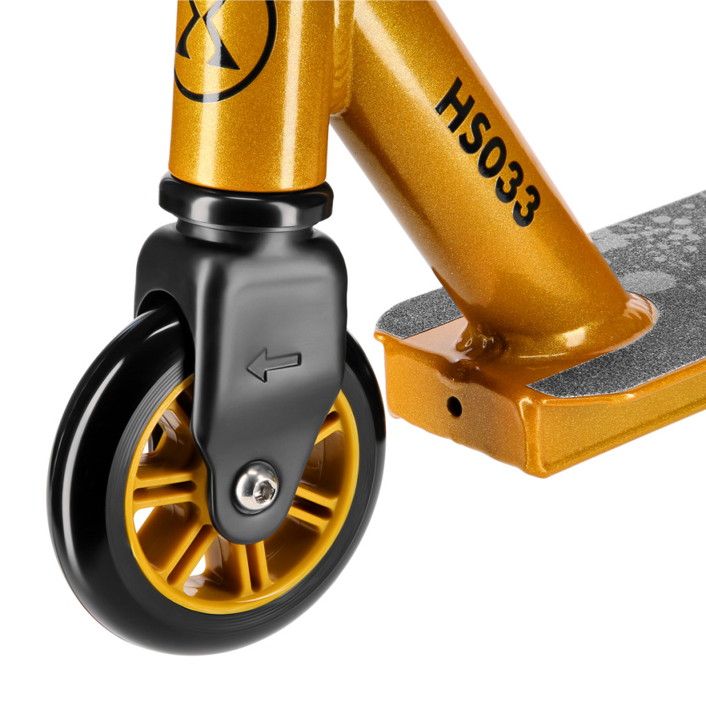 HS033 je ideálny na asfaltový povrch a spevnené mestské chodníky. Kolieska s rozmermi 100 x 24 mm s ložiskami ABEC7 zaručujú rýchlu a svižnú jazdu bez zbytočne vynaloženej námahy. Zadná nášľapná brzda flex fender zase zaisťuje maximálnu bezpečnosť používania a umožňuje okamžité zastavenie kolobežky.