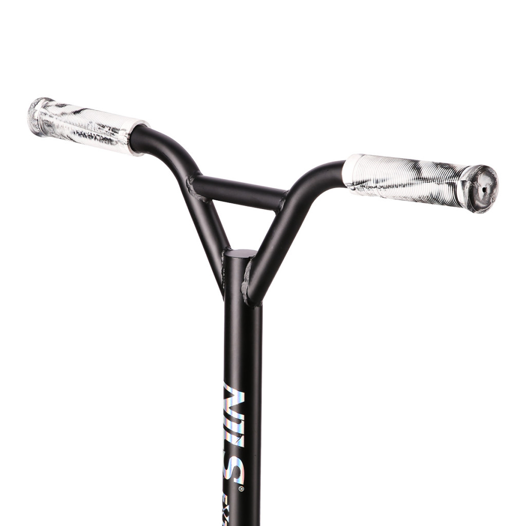 Freestylová kolobežka nemá žiadny skladací mechanizmus ani systém nastavenia výšky riadidiel - tieto typy riešení by mohli oslabiť celú konštrukciu, čo samozrejme nie je žiaduce pri produkte, kde je odolnosť zásadná.