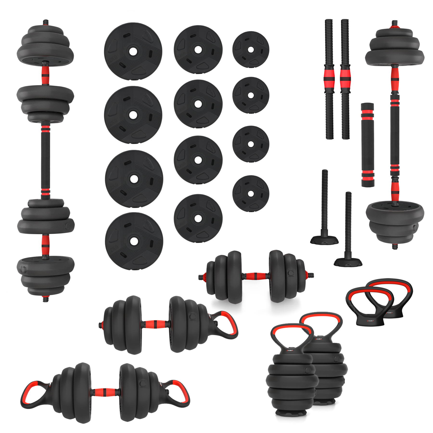 HMS SGN120 6v1 je variabilná a všestranná sada nakladacích činiek, ktorá umožňuje vykonávať širokú škálu silových cvičení s jednou sadou. Sada SGN120 6v1 sa skladá z 12-tich kotúčov, dvoch krátkych osí, jedného spojovacieho dielu, dvoch úchopov a dvoch nakladacích tŕňov pre kettlebell a uzáverov. Kombinovaním jednotlivých dielov môžete vytvoriť vždy jednu z nasledujúcich 6-tich zostáv.