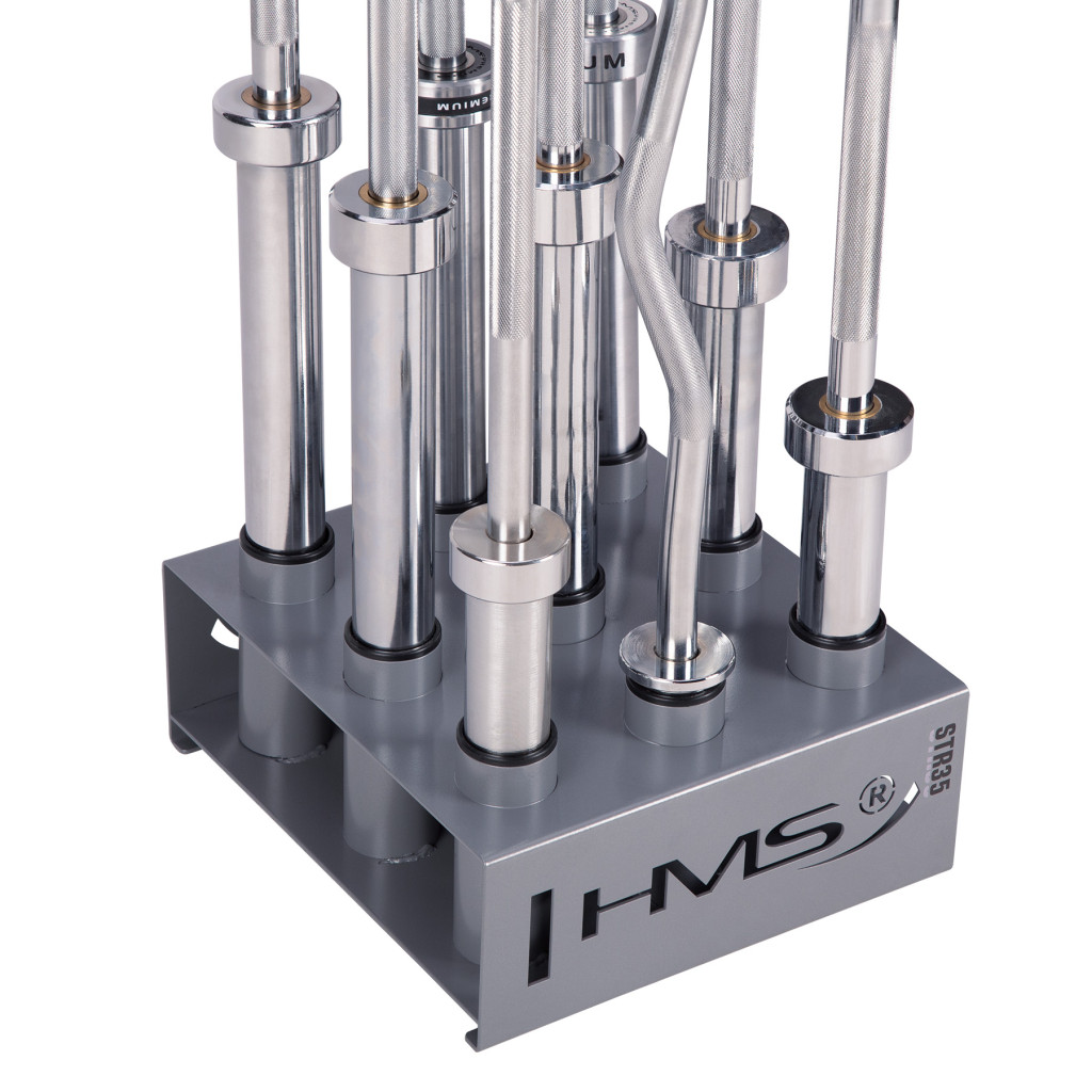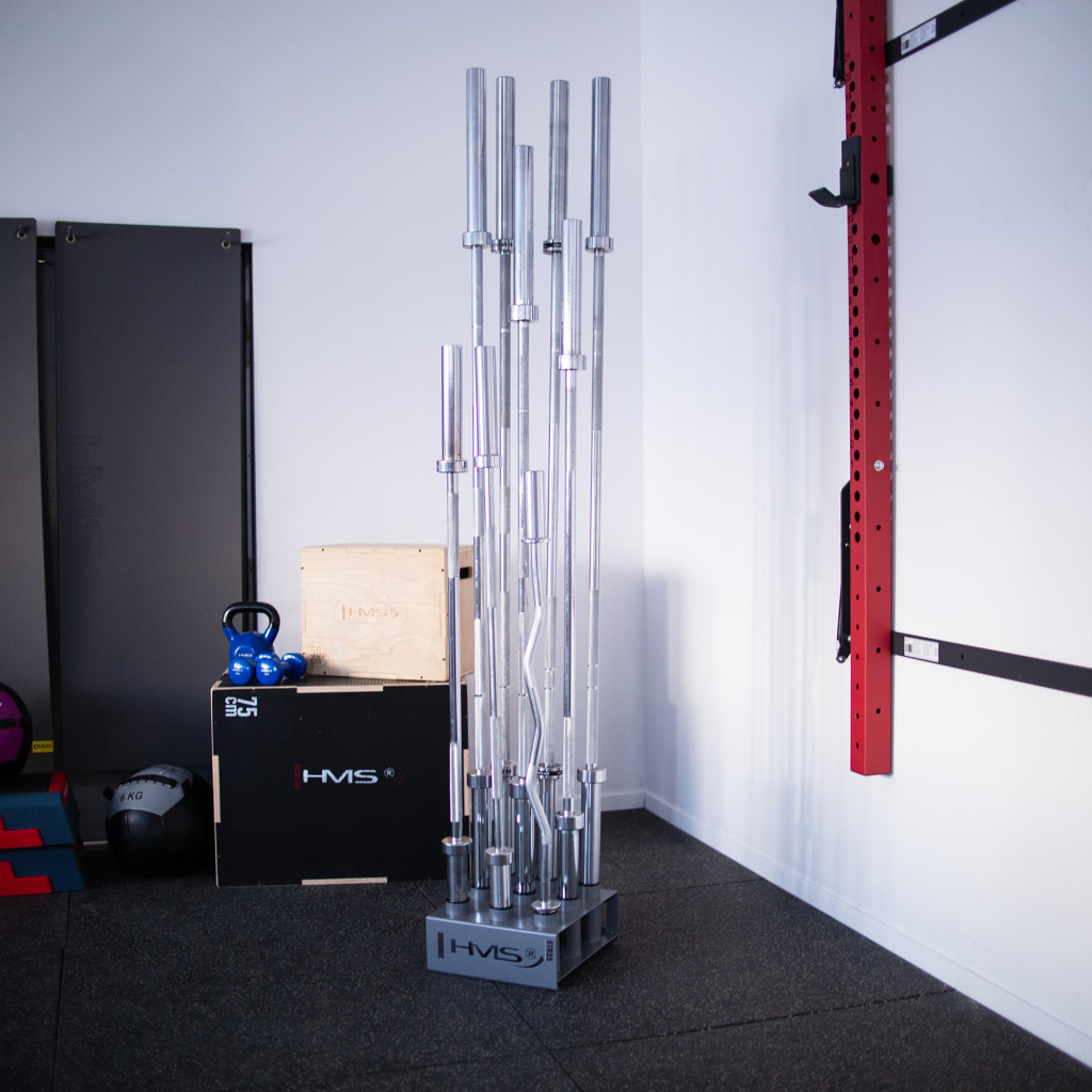 Stojan na olympijské osi STR35 od spoločnosti HMS vám ušetrí veľa miesta vo vašom tréningovom priestore. Umožňuje postaviť deväť osí vedľa seba vo zvislej polohe.