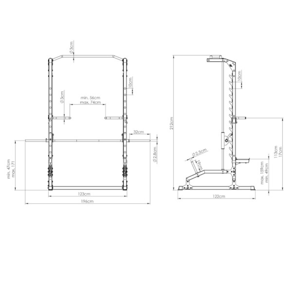 Zariadenie tvorí pohyblivá nakladacia os umiestnená na 2 vodiacich tyčiach, tie zaisťujú plynulý pohyb pri cvičení a špeciálne navrhnuté západky vám dávajú možnosť ľahko uložiť os v jednej z 13 výškových úrovní - stačí otočiť zápästím a činku uzamknúť. Posuvy MS-U105 2.0 sú chránené gumovými dorazmi, ktoré zabraňujú poškodeniu posuvu, pokiaľ činku upustíte bez predchádzajúceho uzamknutia.