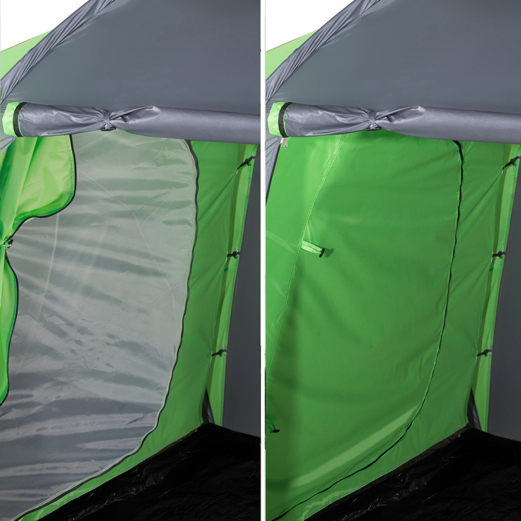 Vysoký komfort odpočinku v náročných poveternostných podmienkach zaisťuje nepremokavá plachta a podlaha s vodeodolnou úpravou do 4000 mm H2O.