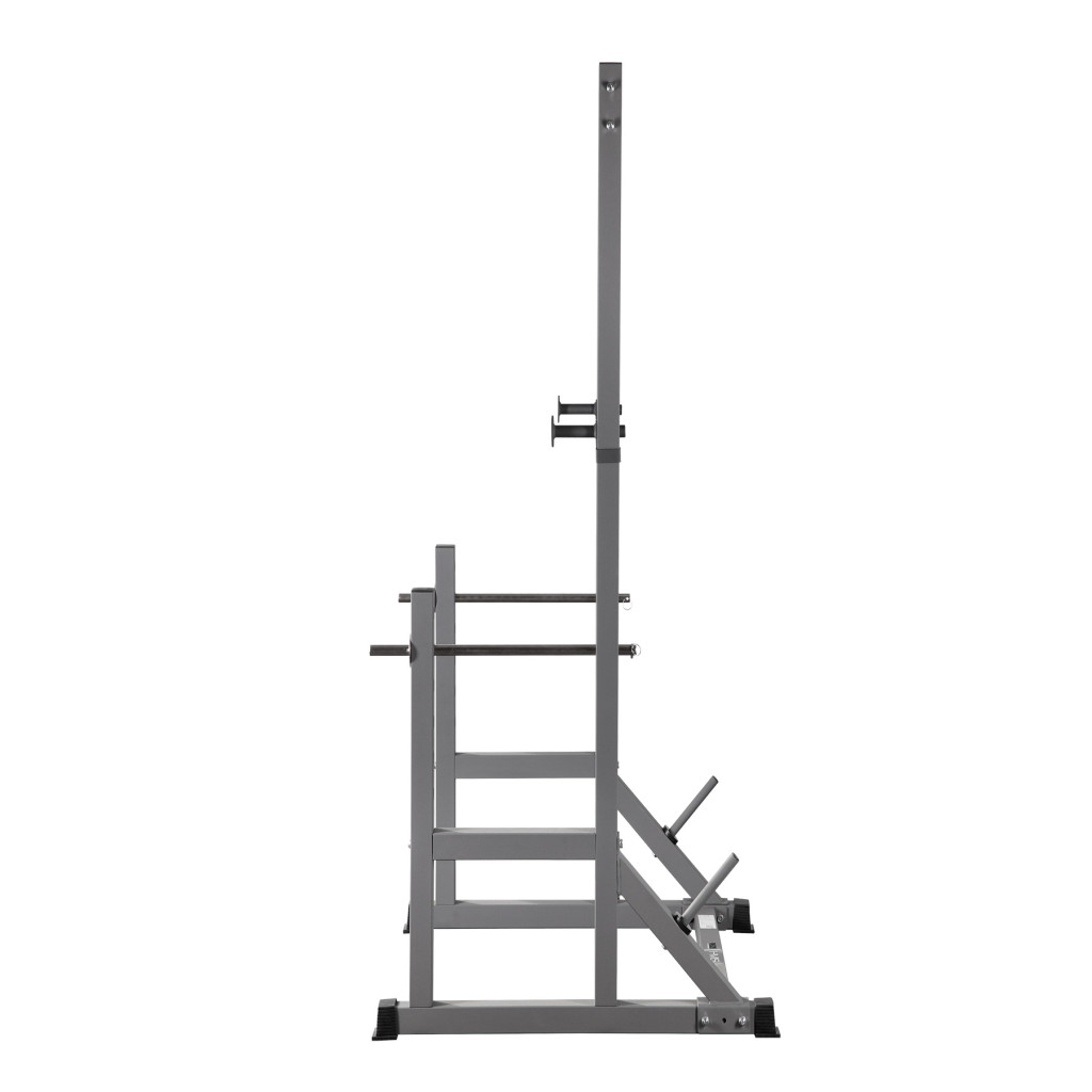 Stojan je tiež vybavený dvoma tŕňmi, ktoré umožňujú organizované a ľahko prístupné uloženie kotúčov. To nielen prispieva k funkčnosti zariadenia, ale tiež pomáha udržiavať poriadok v priestore na cvičenie. Vďaka možnosti použitia tréningovej lavice a odporových gúm, rozširuje stojan PWS20 tréningové možnosti a ponúka používateľom kompletné riešenie pre silový a funkčný tréning.