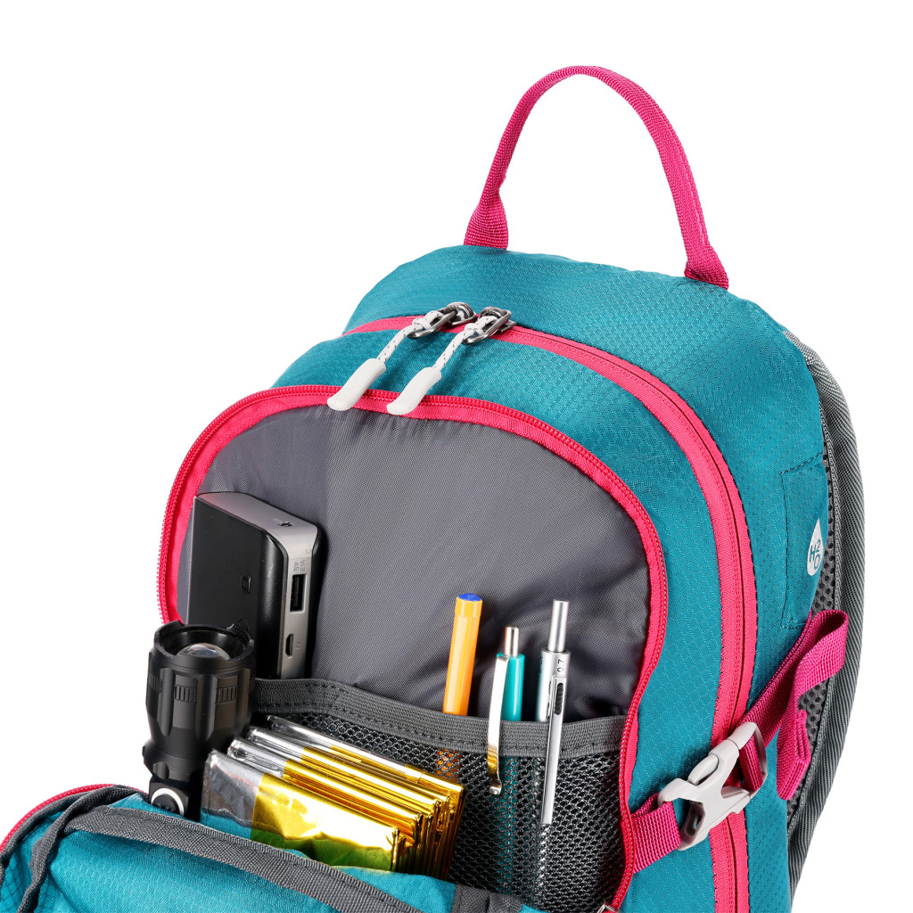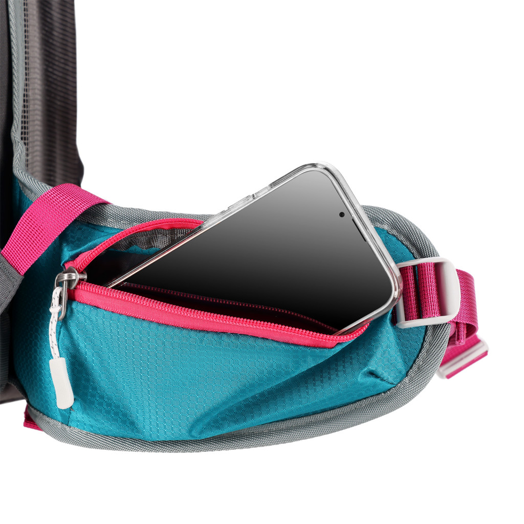 Na pracke hrudného popruhu je umiestnená integrovaná záchranná píšťalka pre väčšiu bezpečnosť v núdzových situáciách. Batoh ďalej ponúka ďalší panel s úchytmi na rôzne príslušenstvo, dve bočné sieťované vrecká a vrecká na zips v bedrovom páse, ideálny na uloženie telefónu alebo iných drobností.