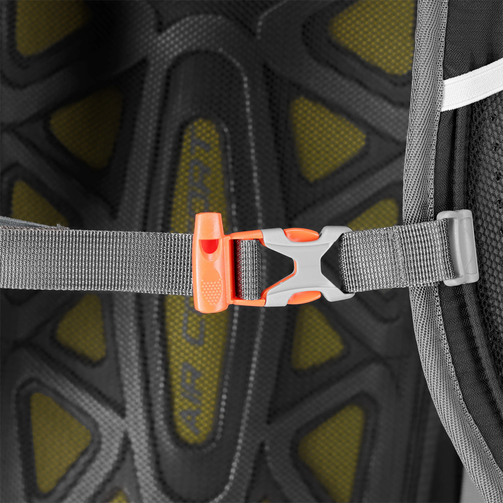 Na pracke hrudného popruhu je integrovaná záchranná píšťalka pre zvýšenie bezpečnosti v prípade núdze. Bedrový pás nielen rovnomerne rozkladá hmotnosť, ale taktiež stabilizuje batoh a navyše ponúka vrecká na drobnosti, ako je desiata, kľúče alebo telefón.