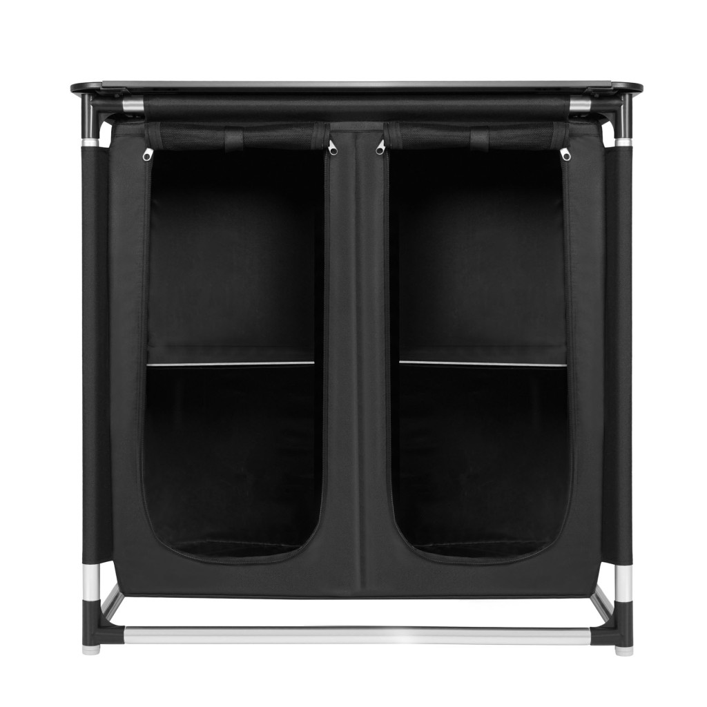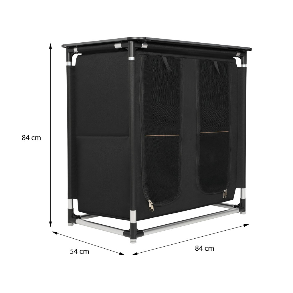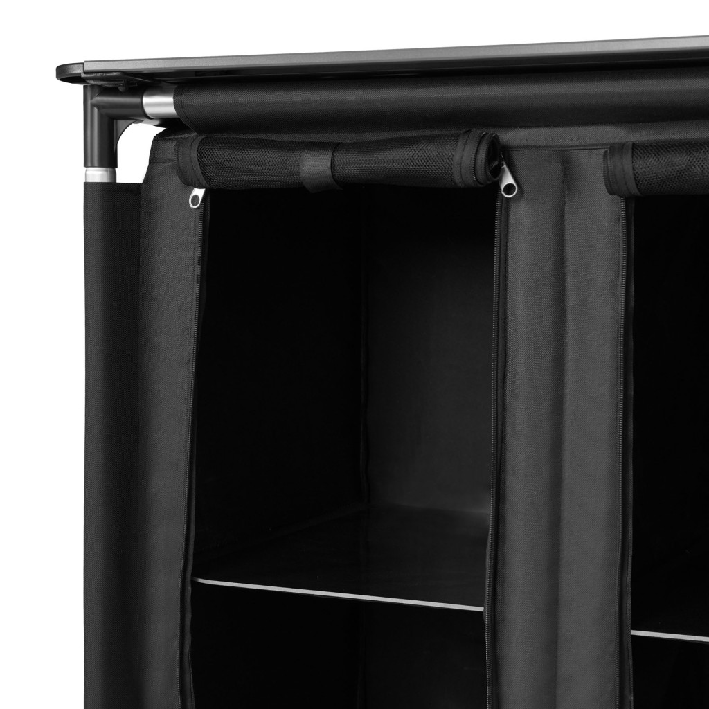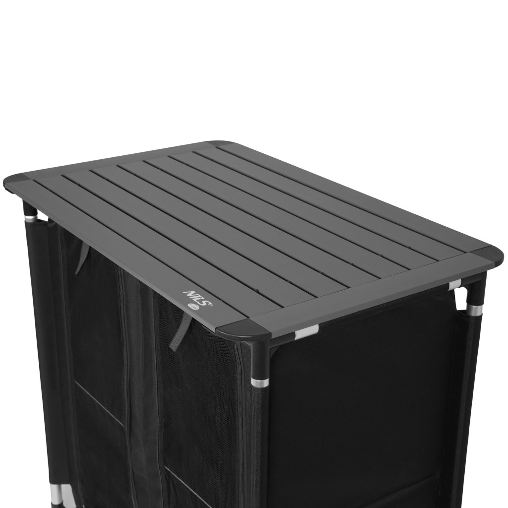 Skriňa NC3032 má celkovo 4 sekcie, ktoré umožňujú pohodlné uloženie potravín, riadu, oblečenia alebo turistického vybavenia. Každá sekcia je vystužená policou z laminovanej preglejky. Hornú, pracovnú dosku tvorí 9 hliníkových lamiel, doska má rozmer 83 x 52 cm. Predné panely na zips účinne chránia obsah pred prachom, vetrom a hmyzom.