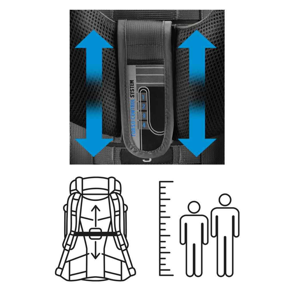 Kľúčovým prvkom modelu je nastaviteľný chrbtový systém Control TORSO, ktorý umožňuje presné prispôsobenie výšky chrbta podľa postavy používateľa. Vďaka tomu dochádza k optimálnemu rozloženiu hmotnosti, čo výrazne zvyšuje stabilitu a pohodlie pri dlhých horských túrach.