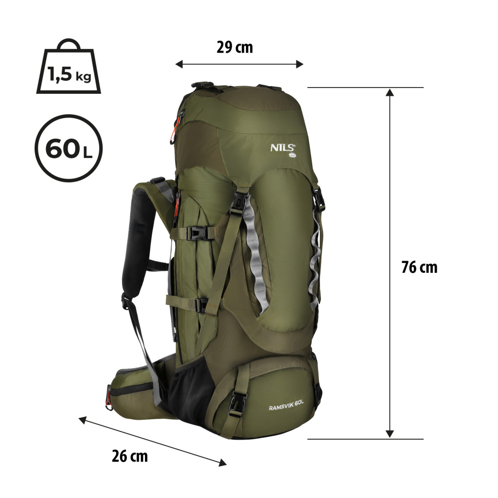NILS Camp NC1994 RAMSVIK 60L je pokročilý turistický batoh navrhnutý pre dlhšie turistické výpravy, kempovanie a outdoorové cestovanie s kompletnou výbavou. Kombinuje veľký objem 60 litrov, vysokú funkčnosť a komfort nosenia aj pri vyššom zaťažení.