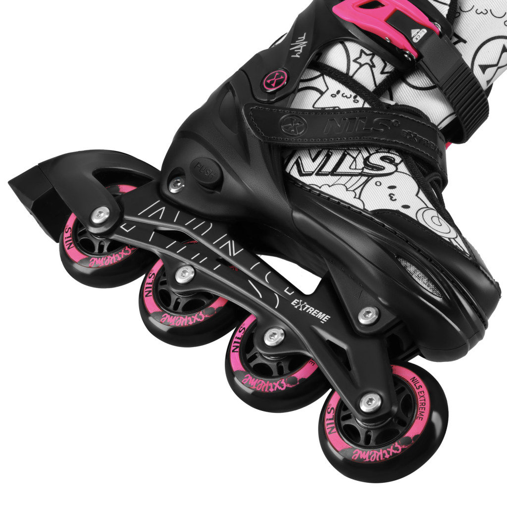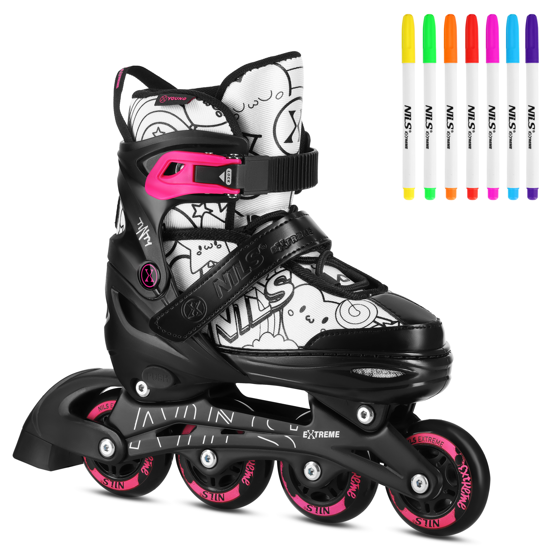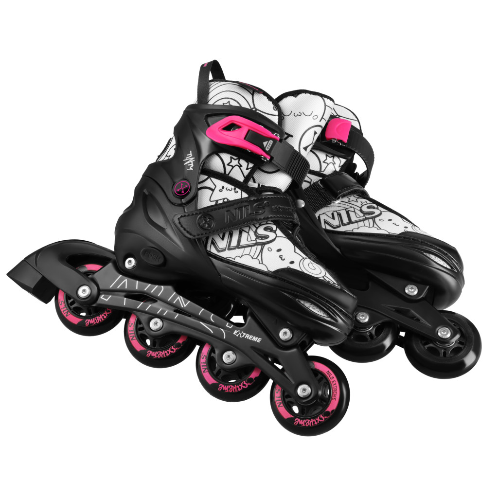 NH10907 TINTY NILS Extreme sú nastaviteľné detské korčule, ktoré umožňujú začať s korčuľovaním zábavnou a kreatívnou formou. Model ponúka praktickú funkciu 4v1, vďaka ktorej možno jeden set používať ako ľadové korčule, inline korčule, klasické kolieskové korčule (quad) alebo 2+2. Týmto spôsobom možno vybavenie ľahko prispôsobiť úrovni dieťaťa i preferovanému štýlu jazdy.