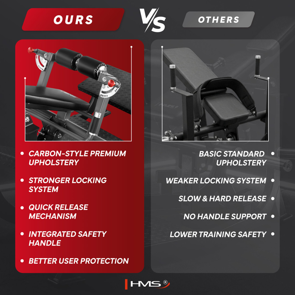MHT8232 HMS je profesionálny stroj na hip thrust navrhnutý pre maximálne efektívny tréning sedacích svalov a bezpečné používanie. Robustná konštrukcia, maximálne zaťaženie až 500 kg, 10-stupňové nastavenie a komfortné čalúnenie s karbónovým vzhľadom z neho robia ideálne vybavenie pre komerčné posilňovne, fitnes centrá aj profesionálne tréningové zóny.